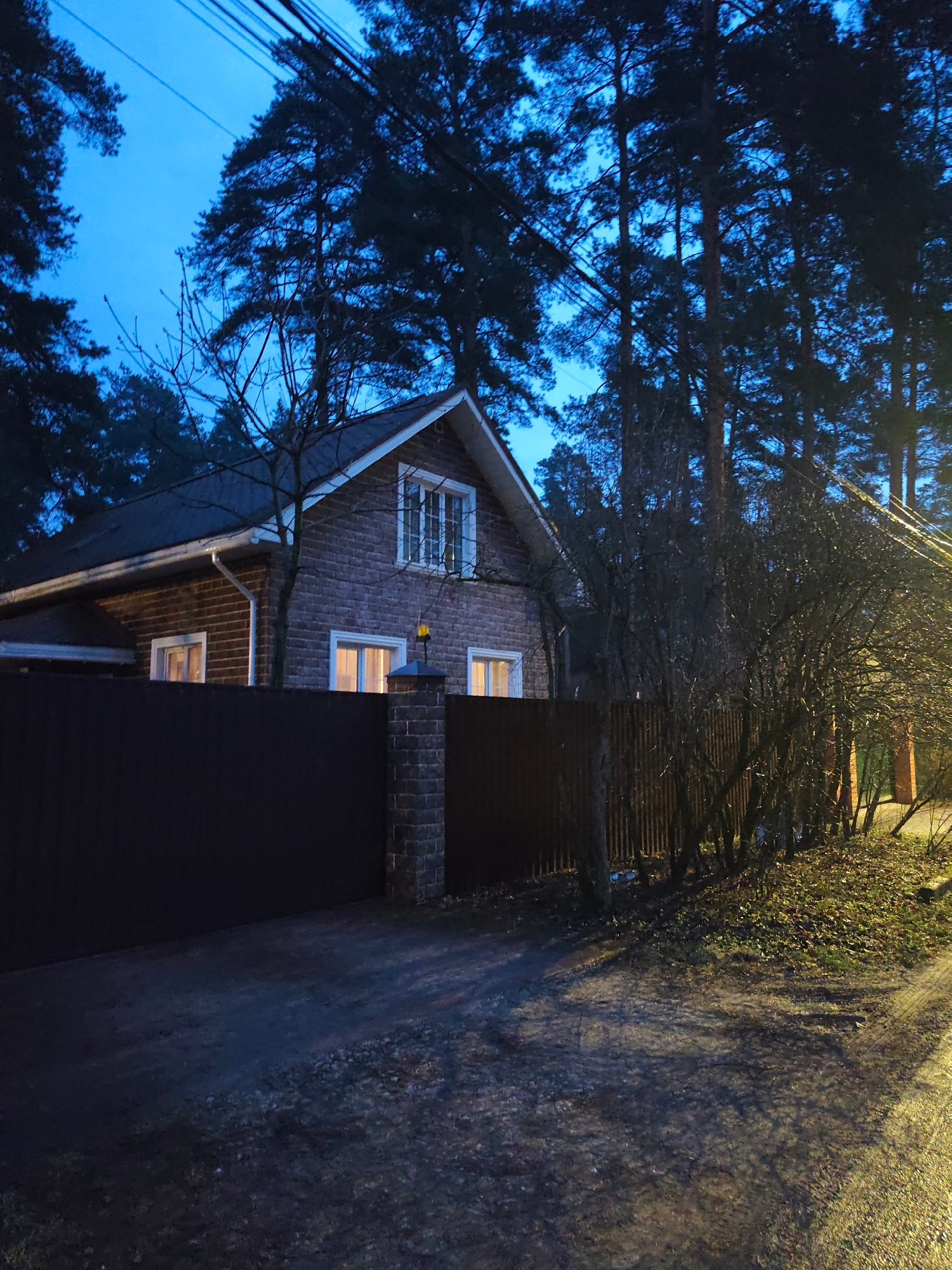 The image depicts a residential area in Kratovo, Russia at dusk or dawn. A brick house with a dark roof and white trim is partially obscured by tall pine trees. The windows of the house are illuminate…read more