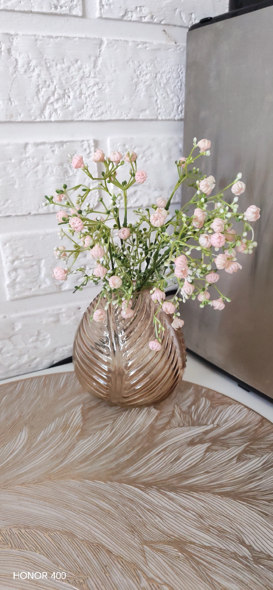 A vase of pink flowers sits on a decorative plate against a white brick wall and a gray metal surface. The flowers are small and delicate, with green stems. The vase is bronze in color and has a textu…read more