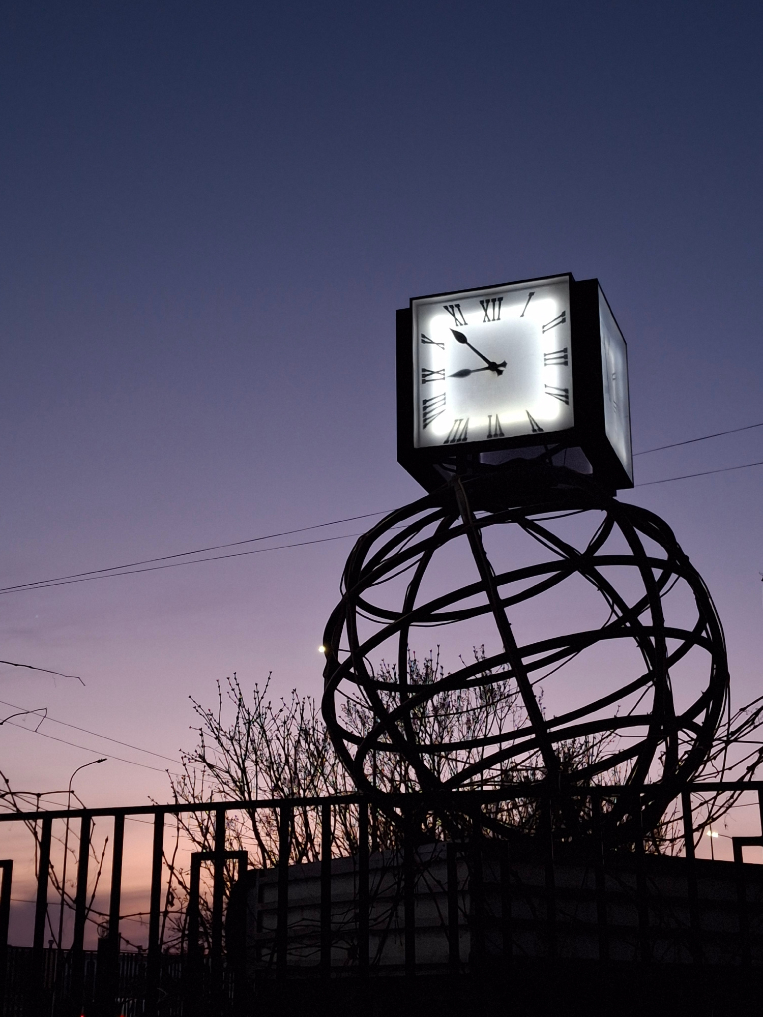 A low-angle, rotated image captures a square clock illuminated against a dusky sky, indicating it's late afternoon or early evening in Chaikovsky, Russia. The clock face displays Roman numerals and th…read more