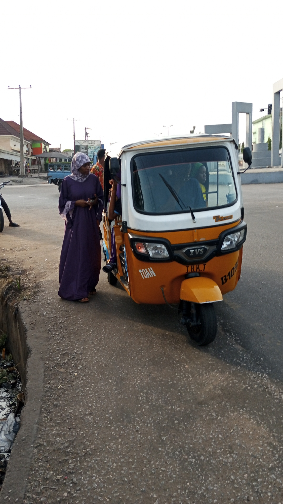 The image shows a woman wearing a purple hijab and dress standing beside an orange and white three-wheeled vehicle, likely a Bajaj or similar type of auto rickshaw. The vehicle has passengers inside.…read more