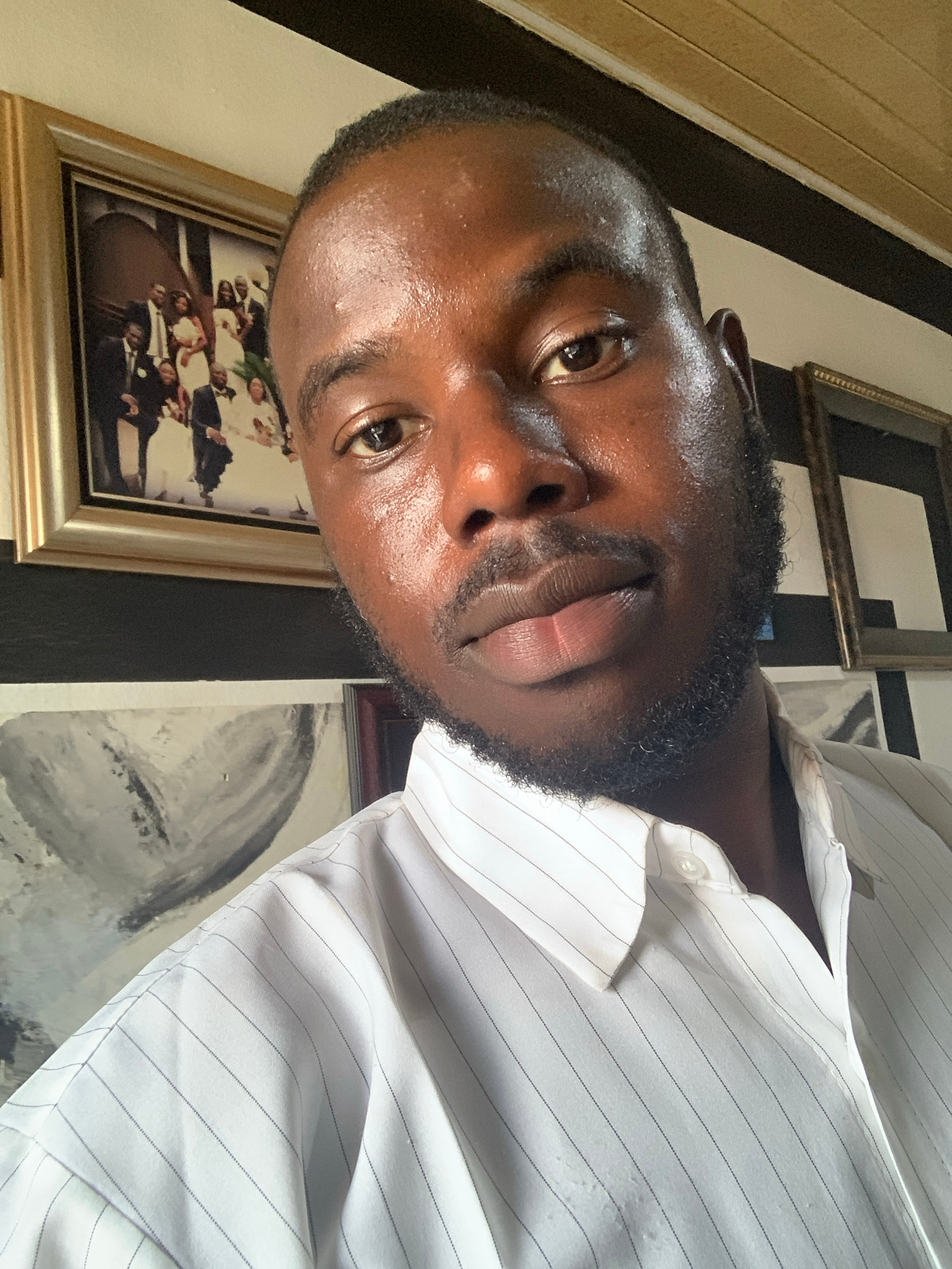 A close-up selfie of a Black man with a beard, wearing a white and gray striped shirt. He is indoors. Behind him are picture frames on a wall. No evidence suggests this image was taken in Jos, Nigeria…read more