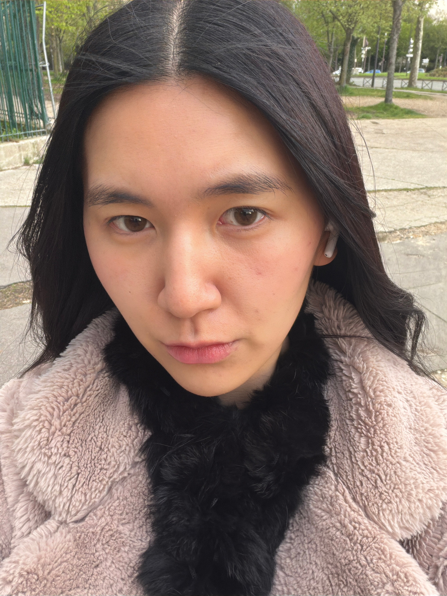 A medium close-up portrait shows a young woman with straight black hair and light brown eyes. She is wearing a light brown, fluffy coat with a black fur collar. A white earbud is visible in her left e…read more