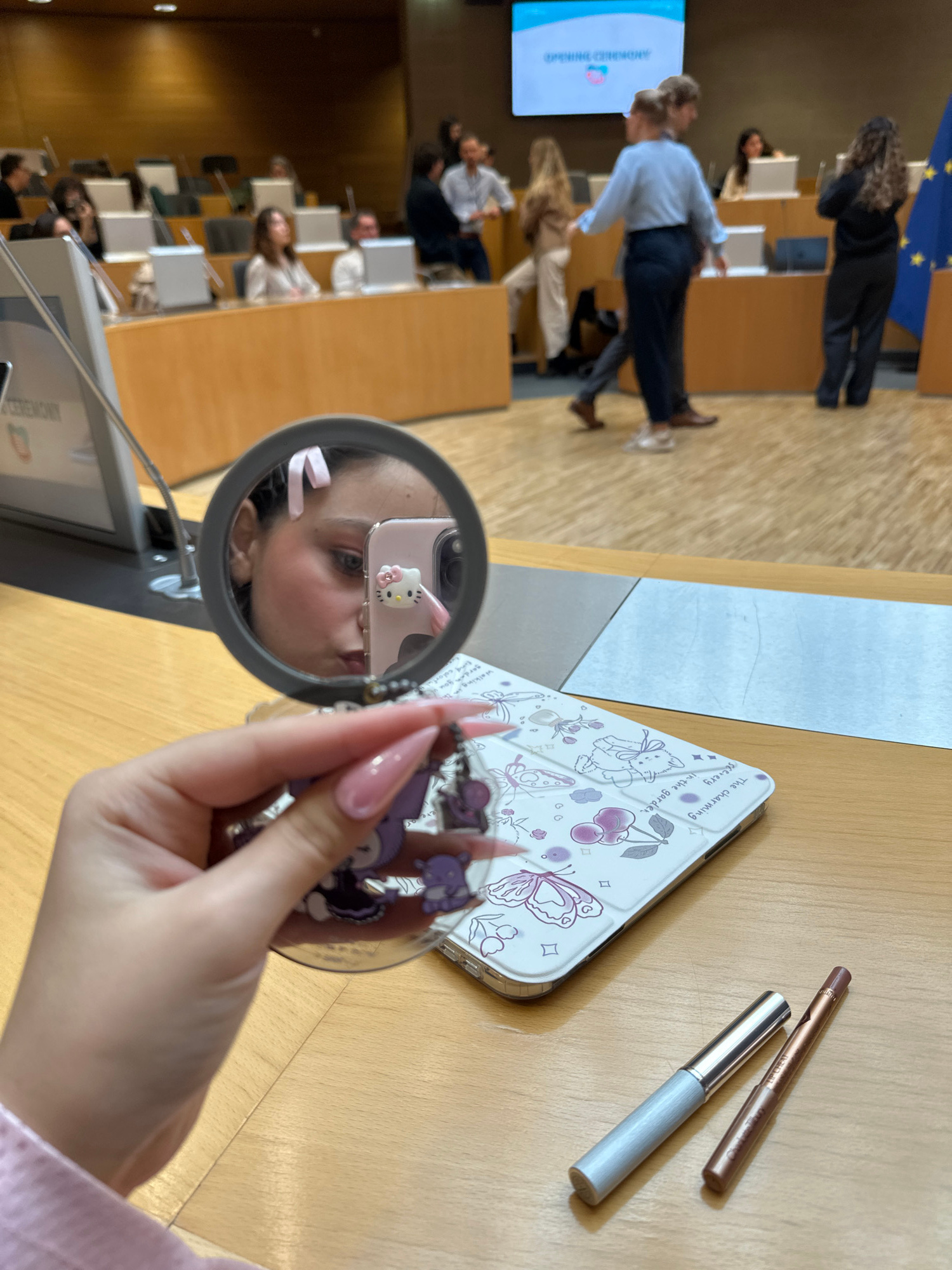 The image shows a woman sitting in an auditorium-style room that appears to be in session. Many people can be seen sitting at tables. A screen in the background displays the words "Opening Ceremony"…read more