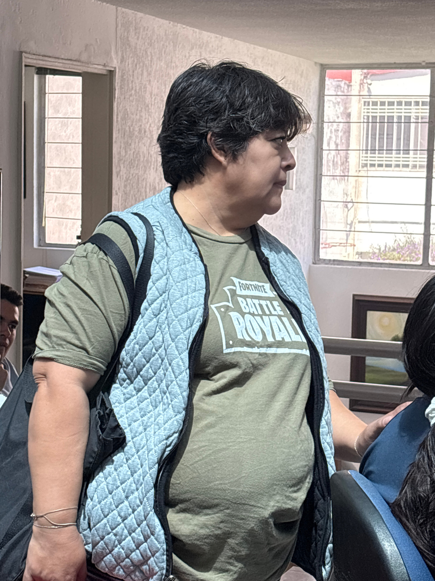 The image, taken indoors in Puebla, Mexico, features a young person with dark, medium-length hair, seen in profile looking upwards. They are wearing an olive green t-shirt with the white text "FORTNIT…read more
