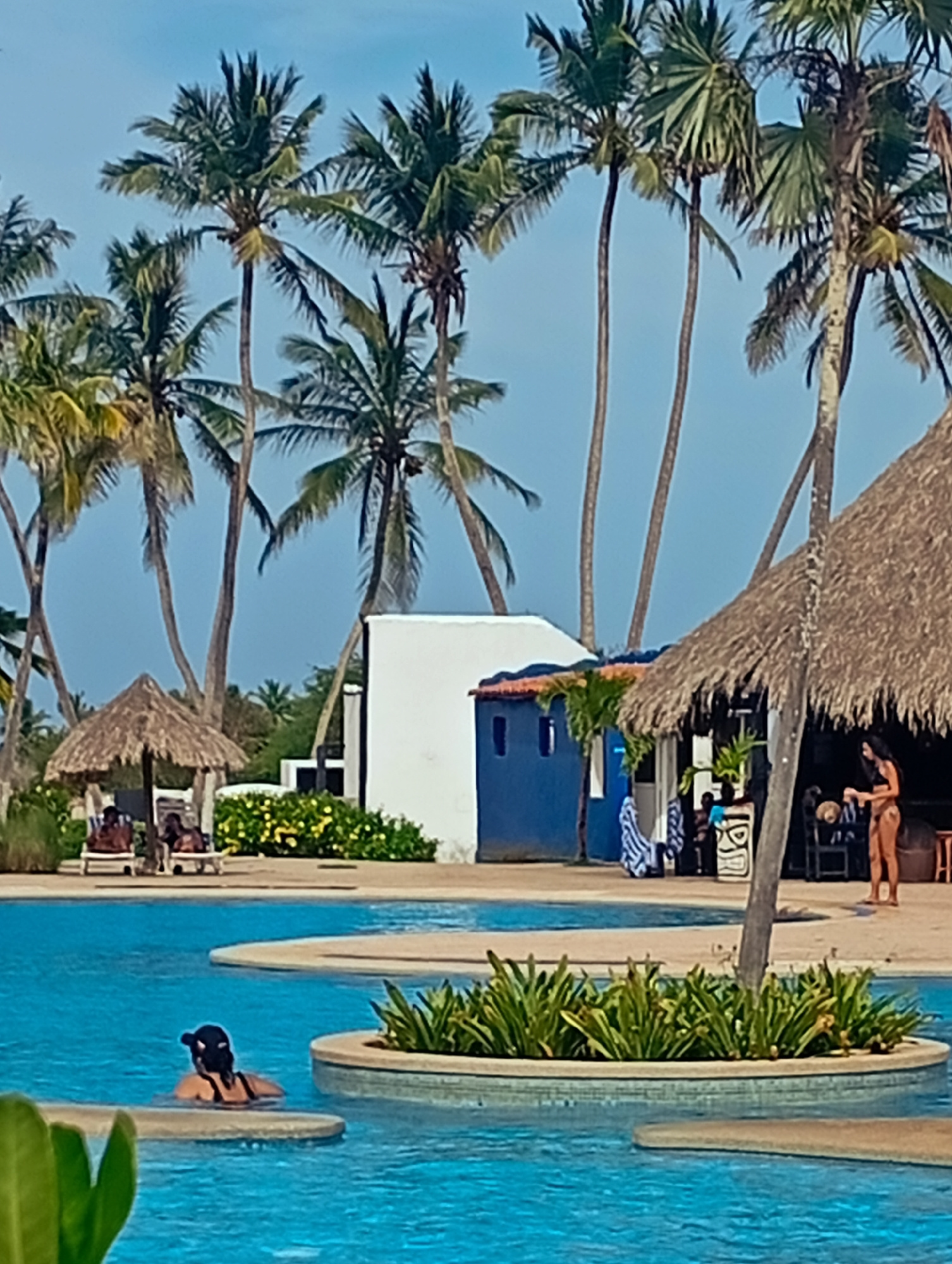 The scene depicts a tropical resort location in Playa El Agua, Venezuela. The foreground features a multi-level swimming pool with a woman in the water wearing a dark cap and swimwear. A small, round…read more