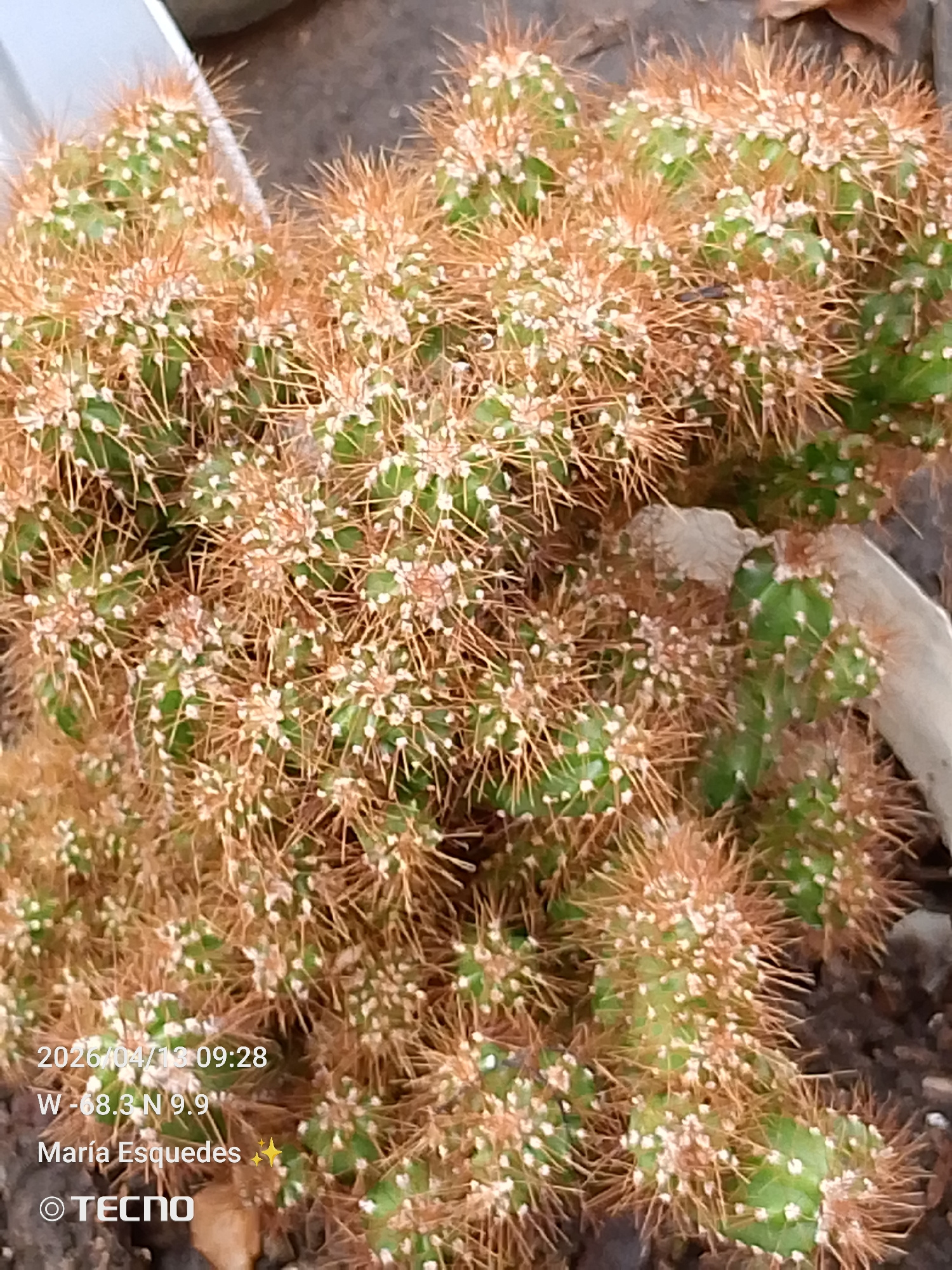 The image shows a cluster of small, green cacti densely covered with brown spines and small white areoles. The cacti are planted in a container with a dark, soil-like substrate. A small, light-colored…read more