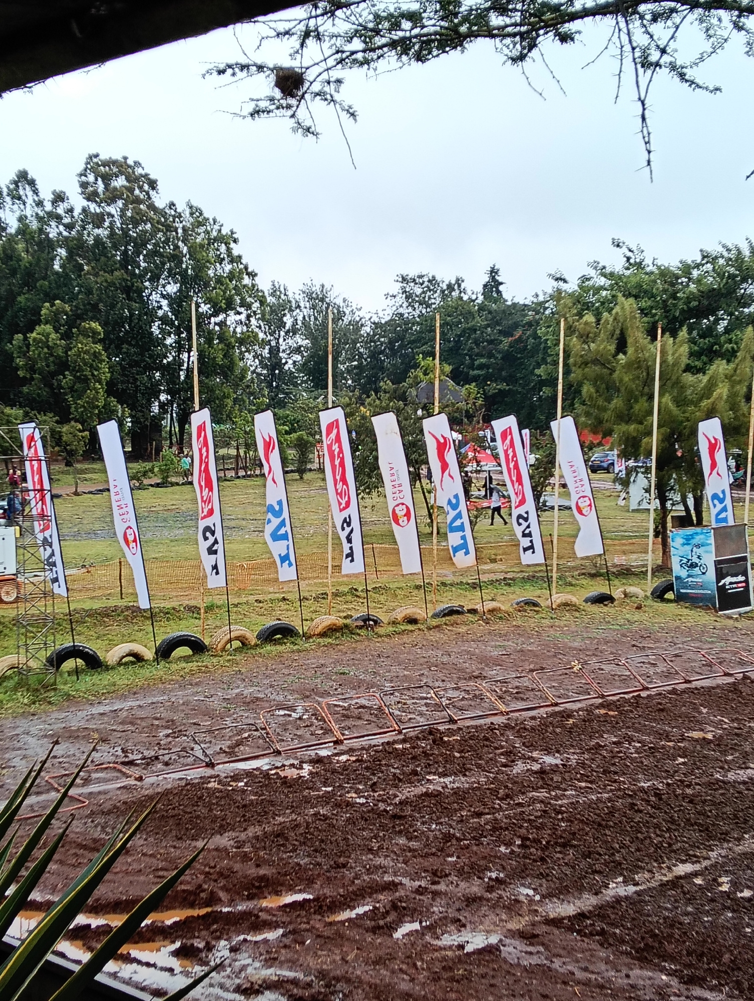 The image shows an outdoor motocross event in Nairobi, Kenya. A muddy track with puddles fills the foreground. A line of white flags with the "TVS" logo and red "Apache" design are placed along the ed…read more
