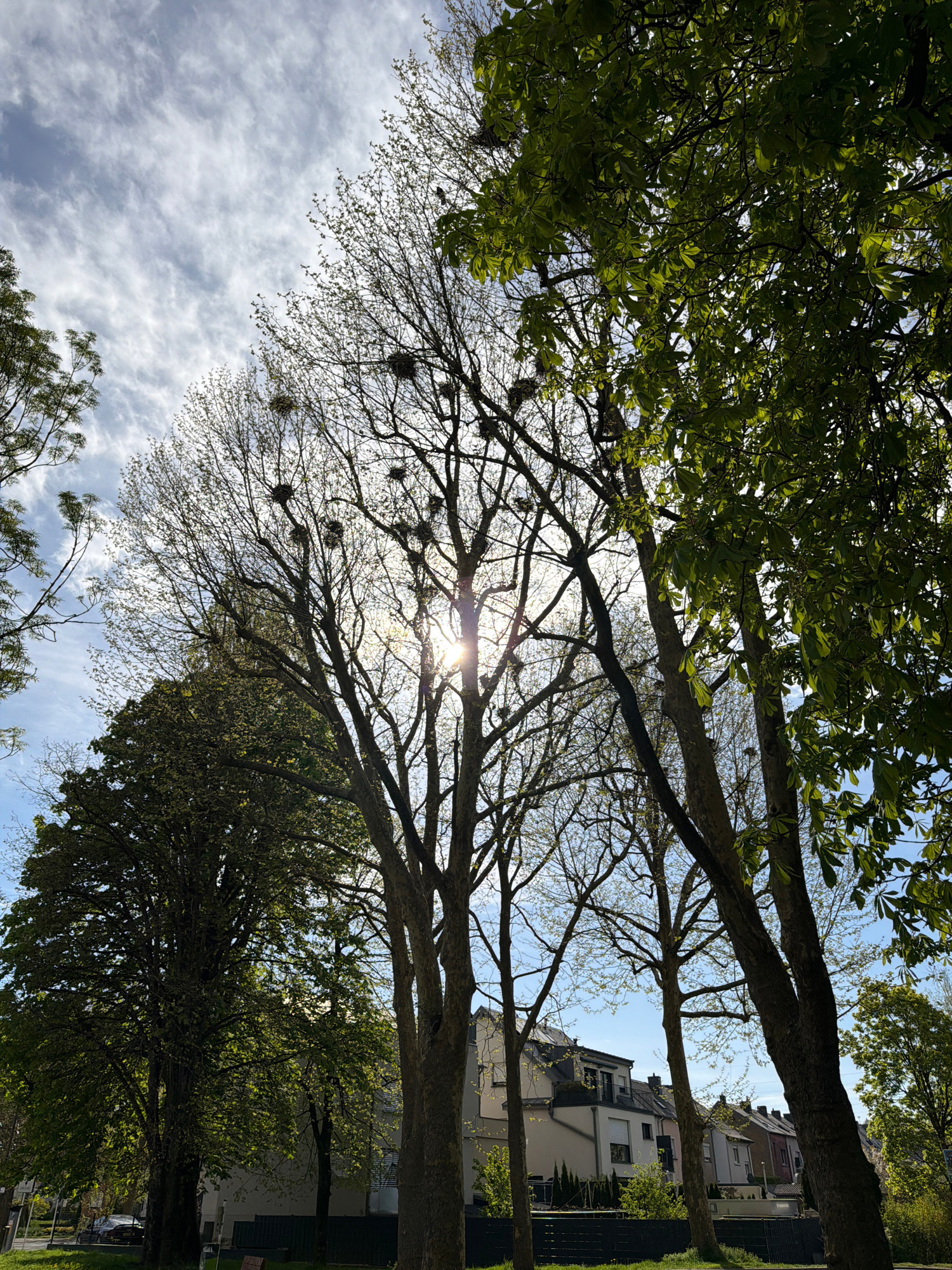 The image is a low-angle shot taken in Esch-sur-Alzette, Luxembourg, looking upwards through the branches of trees toward a partly cloudy sky with the sun visible through the branches. Some of the bra…read more