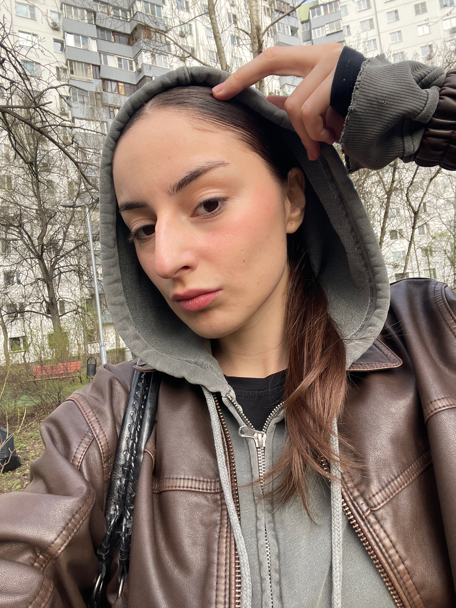 A young woman is positioned outdoors in a casual pose, wearing a brown leather jacket over a grey hooded sweatshirt. The hood of the sweatshirt is drawn up around her head, with her right hand touchin…read more