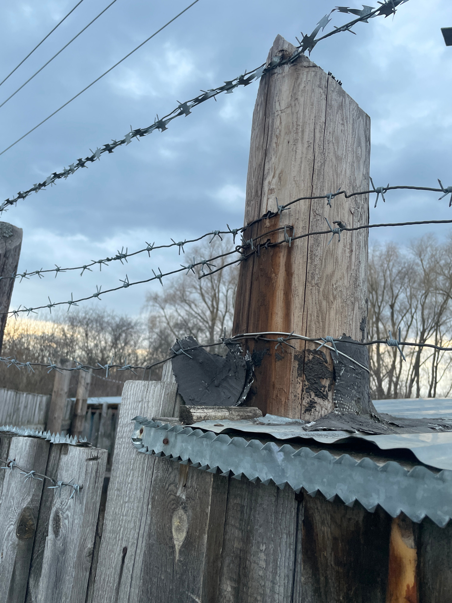 The image shows a close-up of a fence with barbed wire in what is potentially an outdoor setting. The fence is constructed of weathered wooden planks and posts. On top of the fence, there is a strip o…read more