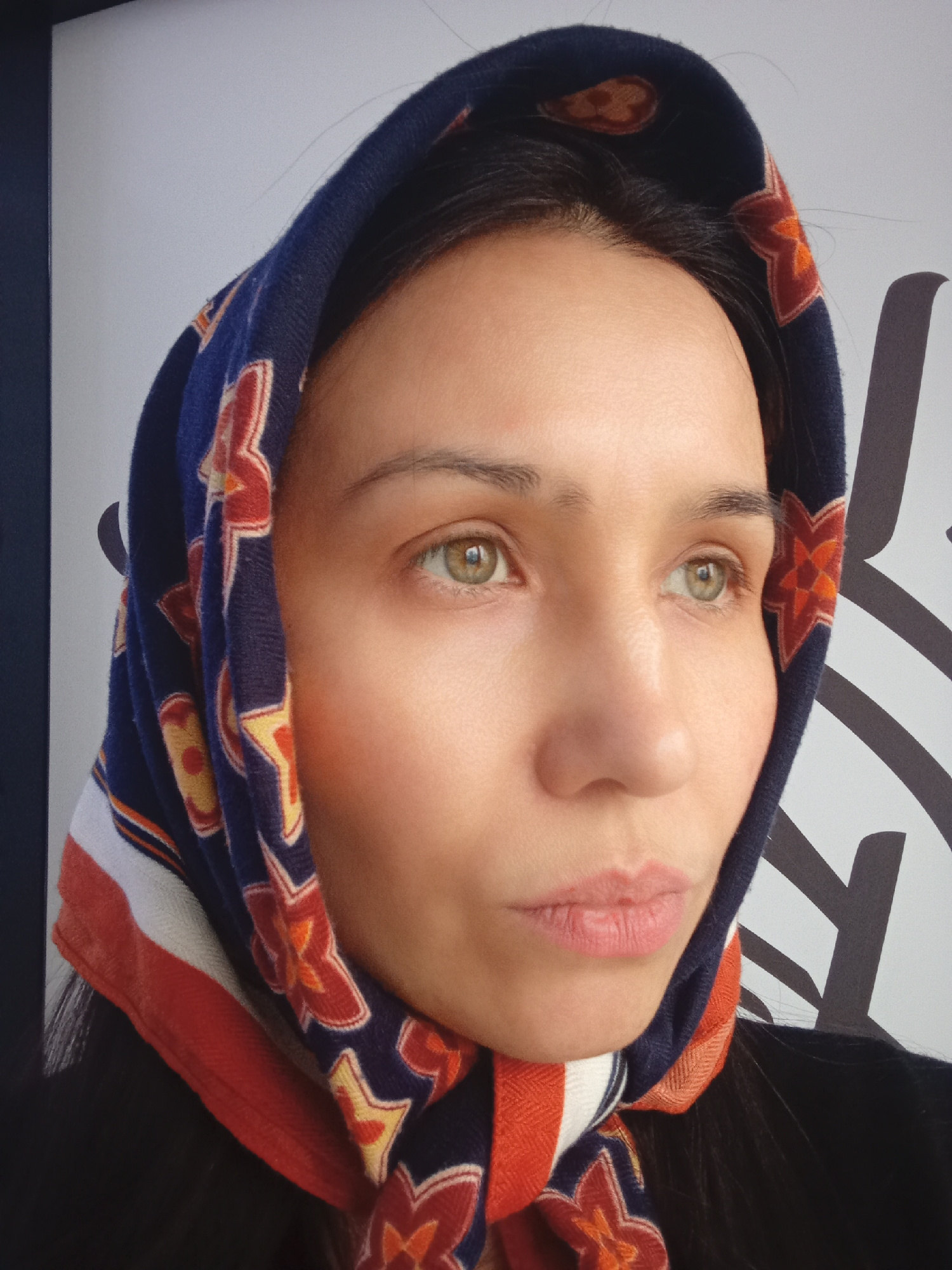A close-up, eye-level portrait captures a woman wearing a patterned headscarf. The scarf, tied in a babushka style, features a prominent navy blue base adorned with repeating patterns in orange, red,…read more