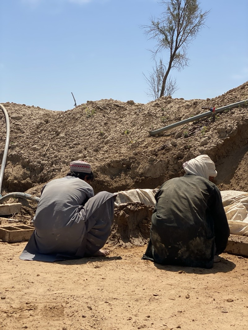 Two men squat in front of an earthen berm in what appears to be an arid environment. One man is wearing a grey outfit and a small, patterned cap, while the other is wearing a dark outfit and a white hโฆread more