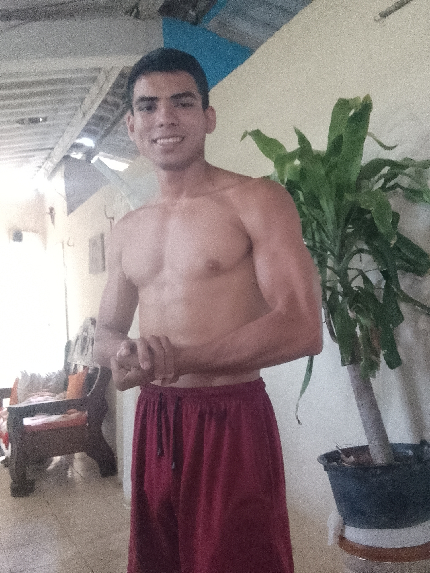 A shirtless, smiling, young man stands indoors wearing maroon drawstring pants. He is flexing his left arm and holding his hands together. Behind him to the right is a potted green plant. Behind him t…read more