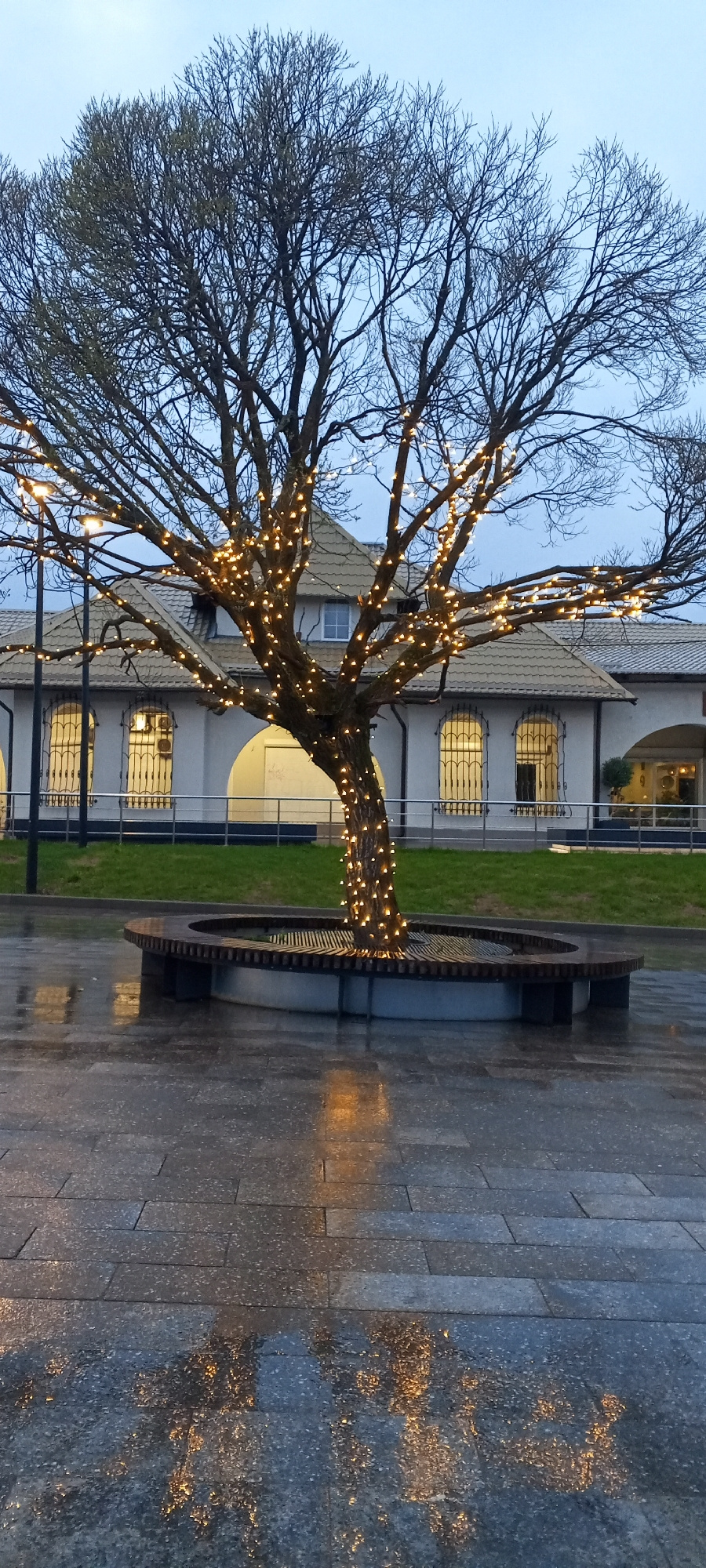 The image depicts a tree decorated with lights in a public space, likely a square or pedestrian area. The tree is bare of leaves, suggesting it is late fall or winter. A circular bench surrounds the b…read more