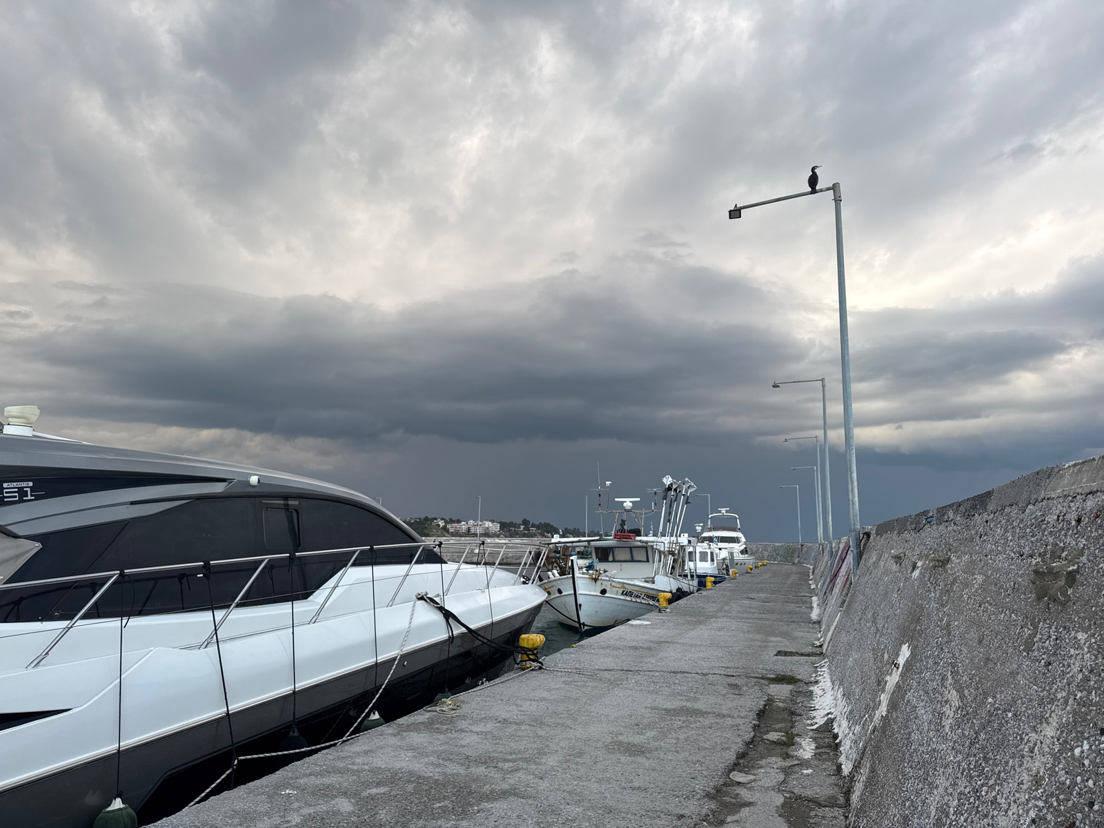 The image depicts a marina or harbor in Νέα Καλλικράτεια, Greece. Several boats are moored along a concrete pier. The largest boat on the left is a modern yacht with a gray and white hull. Further dow…read more