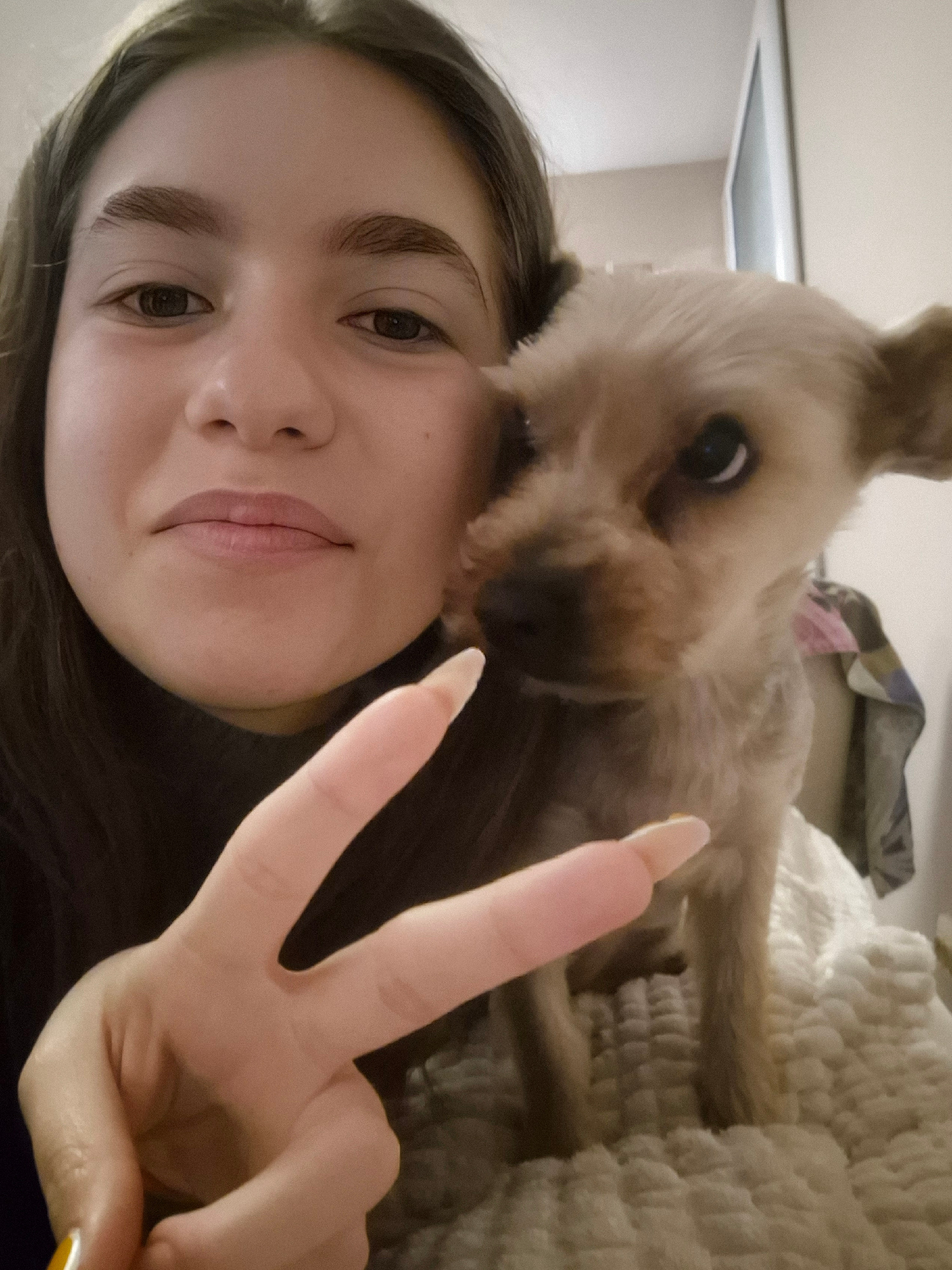 A young woman is taking a selfie with a small, light-brown dog. The woman is holding up her hand in a peace sign, with her fingers near the dog's face. The background is blurry, showing a bed with a t…read more