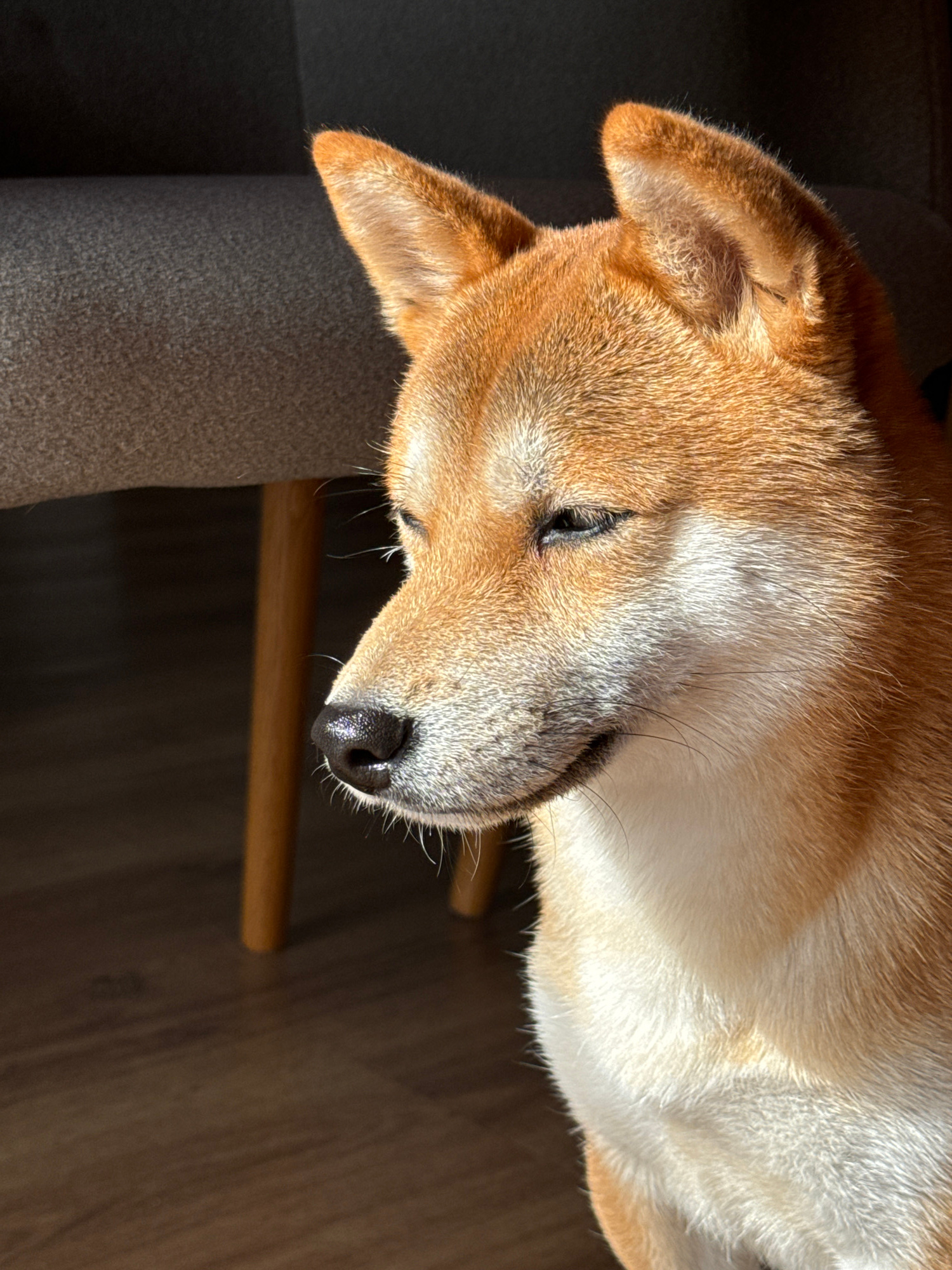 A Shiba Inu dog is lying down. The dog is light brown and white, with a black nose and one eye slightly visible. The dog's head rests on a gray fabric surface, possibly a chair. A wooden object, possi…read more