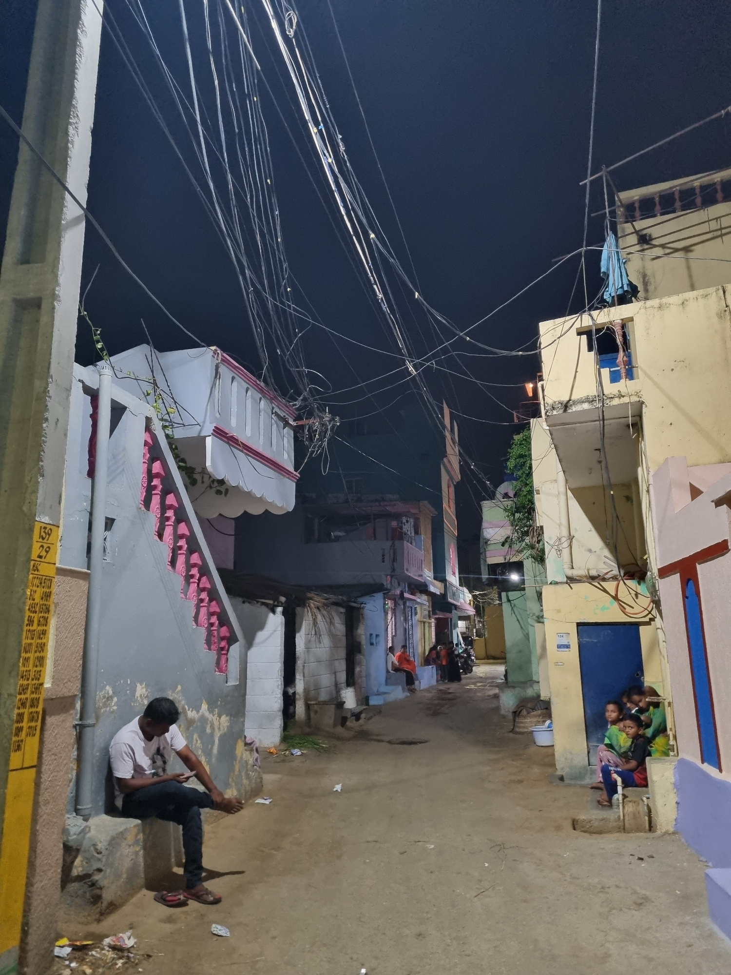The image shows a nighttime scene in Pedda Kammavaripalli, India. A man sits on a low concrete structure on the right side of the image, looking at a mobile phone. The background is a street lined witβ¦read more