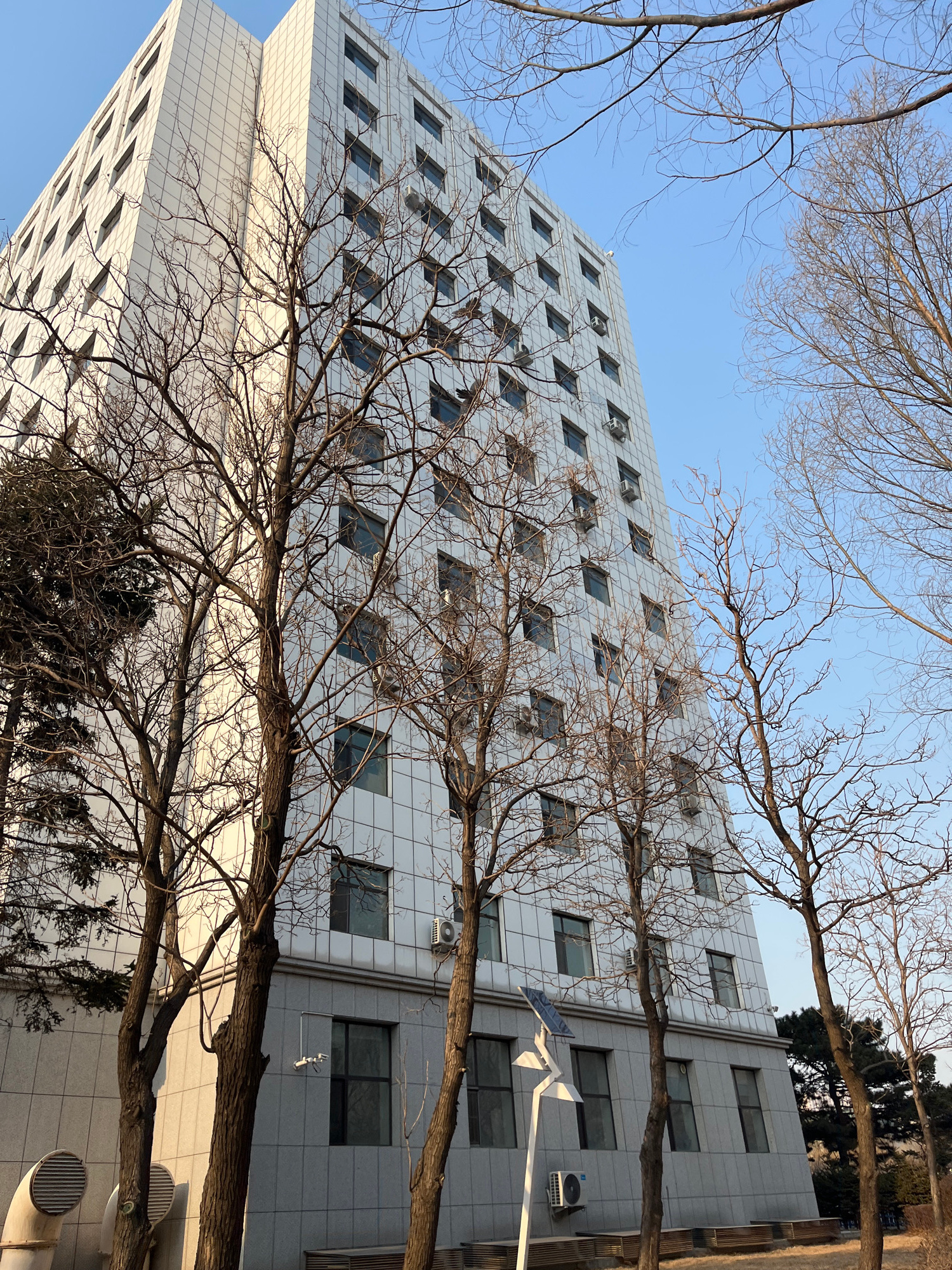 The image displays a multi-story building situated in Changchun City, China. The structure features a white paneled upper facade with numerous dark, rectangular windows, many equipped with external ai…read more