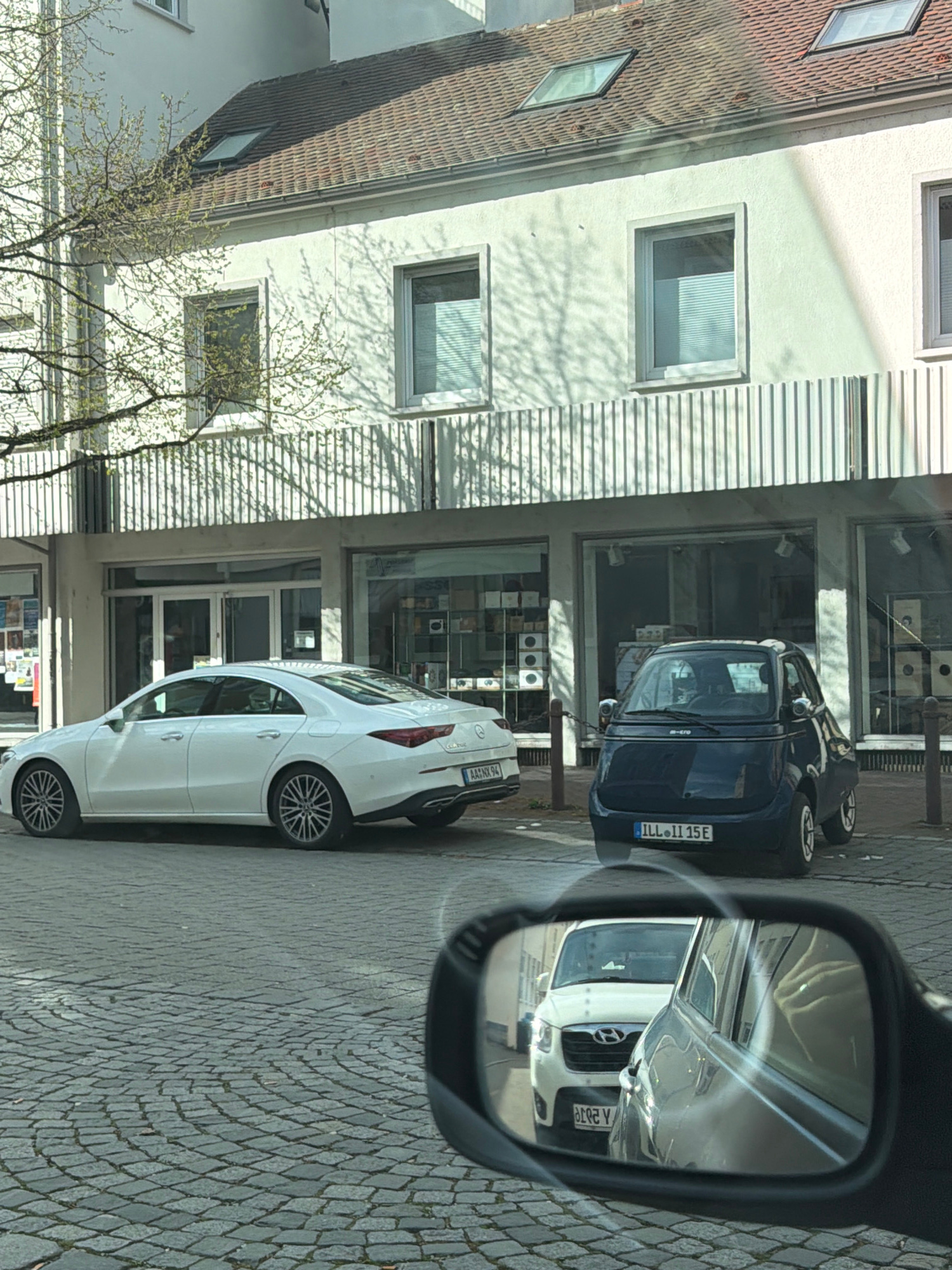 The image shows a street scene in Ulm, Germany. A white Mercedes-Benz CLA coupe is parked on the cobblestone street, parallel to a building with storefronts and apartments above. A blue electric car,…read more