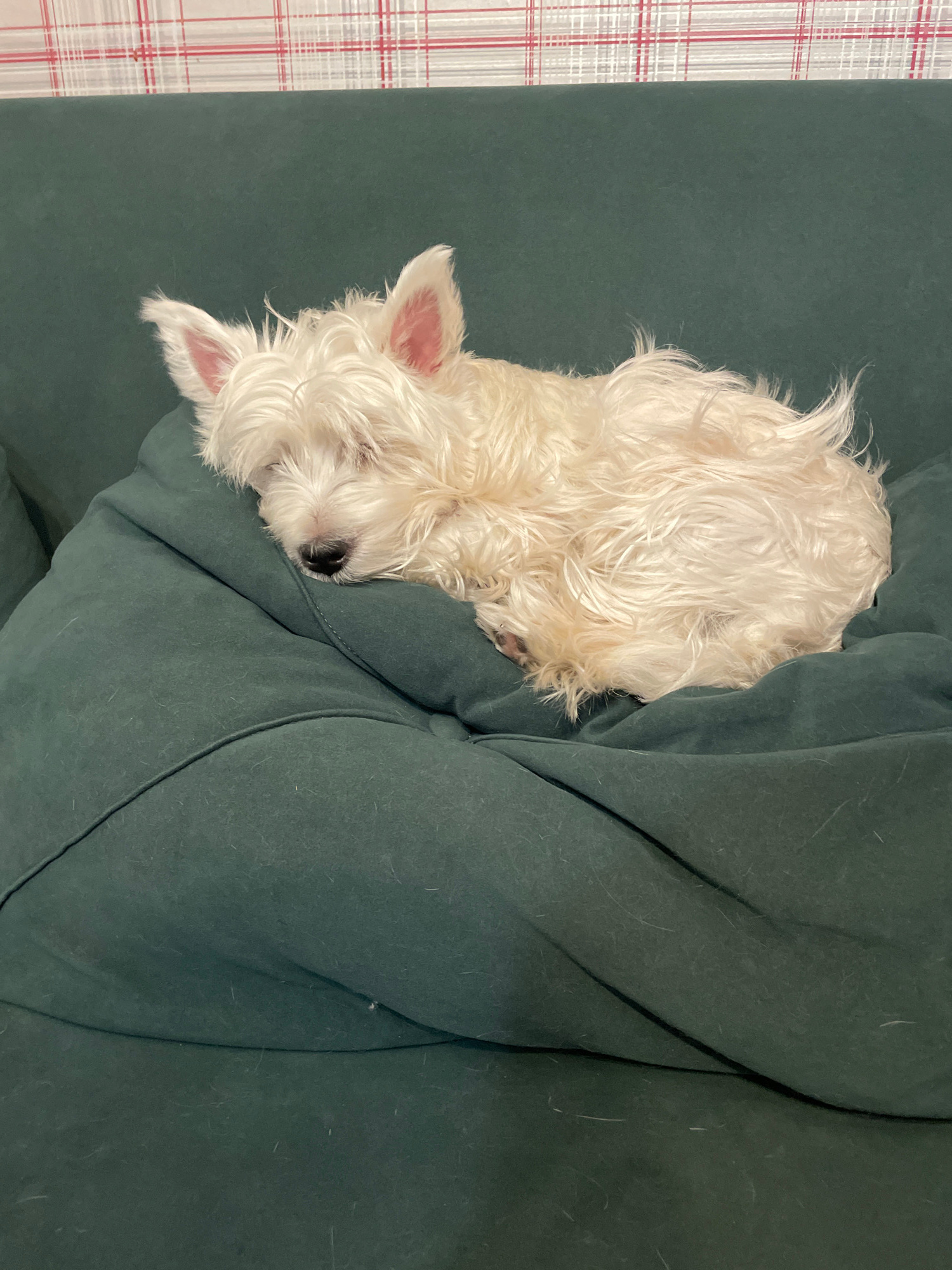 A white West Highland White Terrier dog is asleep on a dark green cushion or sofa. The dog is curled up, with its head resting on a fold of the cushion. Part of a plaid pattern is visible in the backg…read more