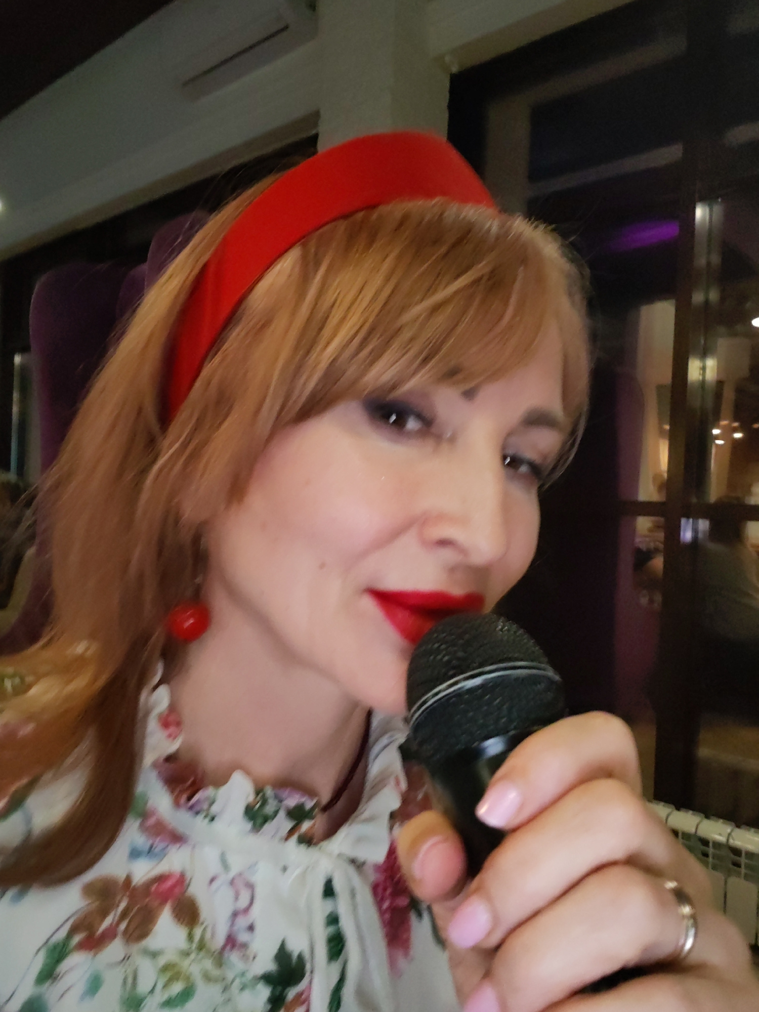 A woman with light reddish-brown hair and a red headband is holding a black microphone and singing. She has red lipstick and a red earring. She is wearing a floral-patterned blouse with a white ruffleβ¦read more