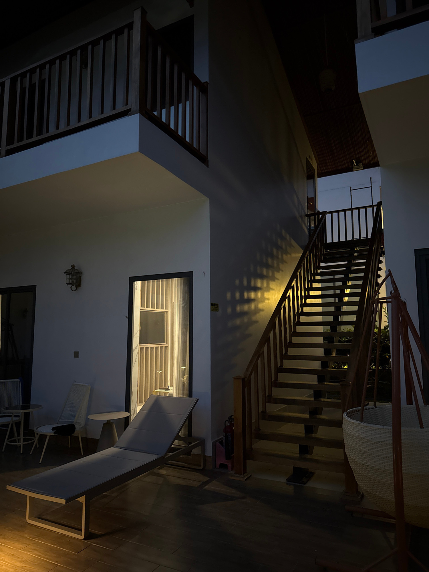 This media file captures a multi-level interior space, likely within a resort, hotel, or large residence in Phú Quốc, Vietnam, during the evening or night. The scene is dominated by a large wooden sta…read more