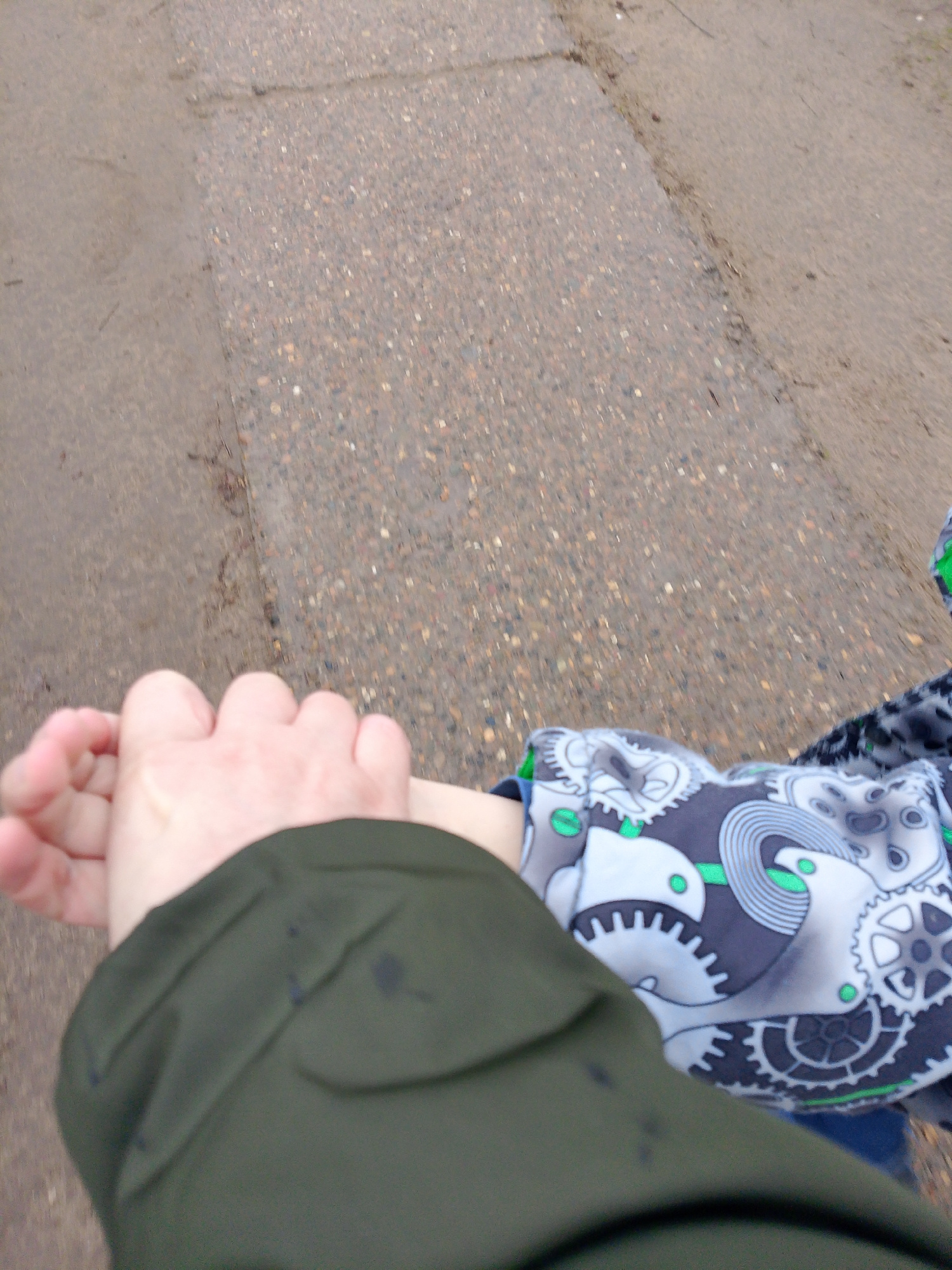 The image shows a close-up, first-person perspective of an adult holding a child's hand while walking outdoors in Noviy, Russia. The adult's arm, visible on the left, is covered by a dark olive-green…read more
