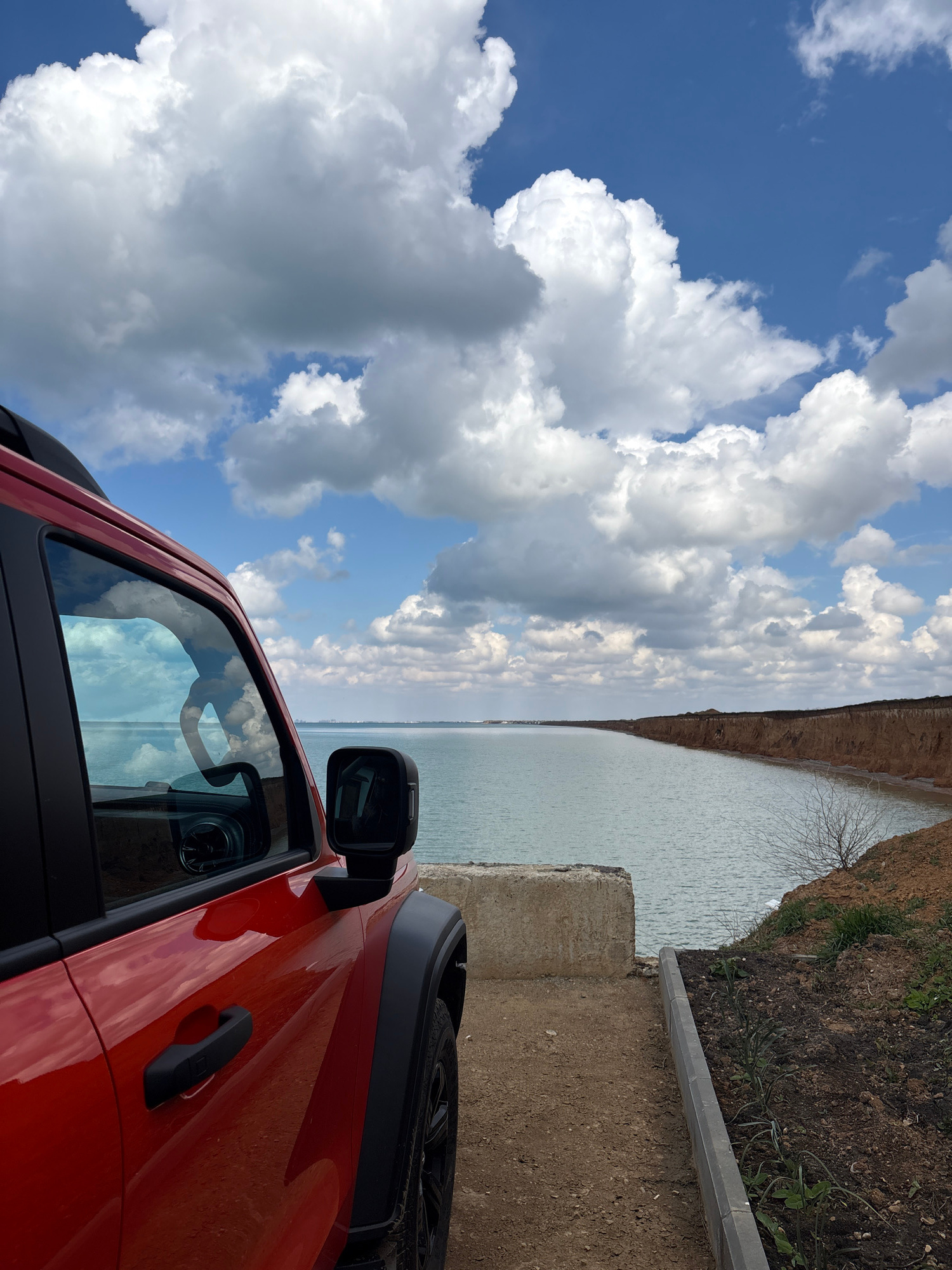 The image depicts a scene at a waterfront location, likely near a body of water within or around Николаевское сельское поселение, Ukraine. An orange vehicle is positioned near a concrete embankment or…read more