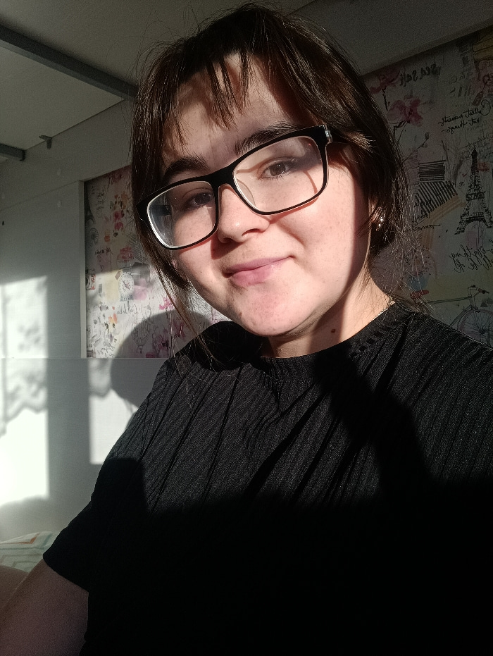 A female individual is depicted in a medium close-up portrait, located indoors within what is understood to be the city of Noviy, Russia. She has dark brown hair with bangs, wears black-framed glasses…read more