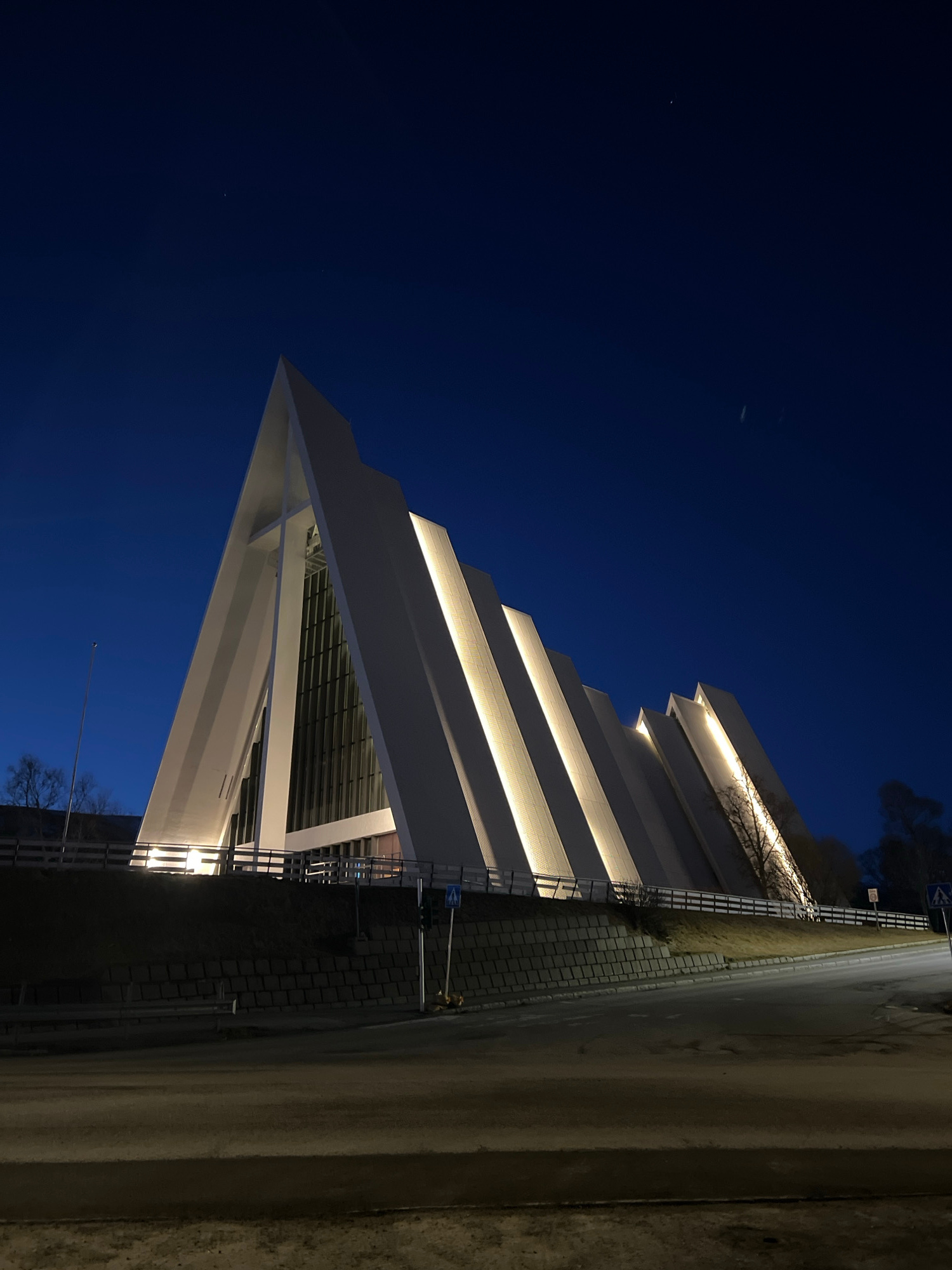 The image, captured at night, presents a striking modern building with angular architecture against a deep blue, clear sky. The photo is oriented vertically, showing the building on the left half of t…read more
