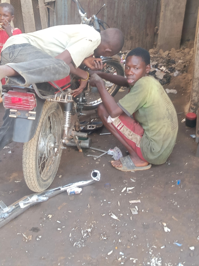 Two young men work on a motorcycle. One leans over the bike, appearing to work on the engine. The other squats nearby, looking at the camera. A new chrome exhaust pipe lies on the ground next to vario…read more