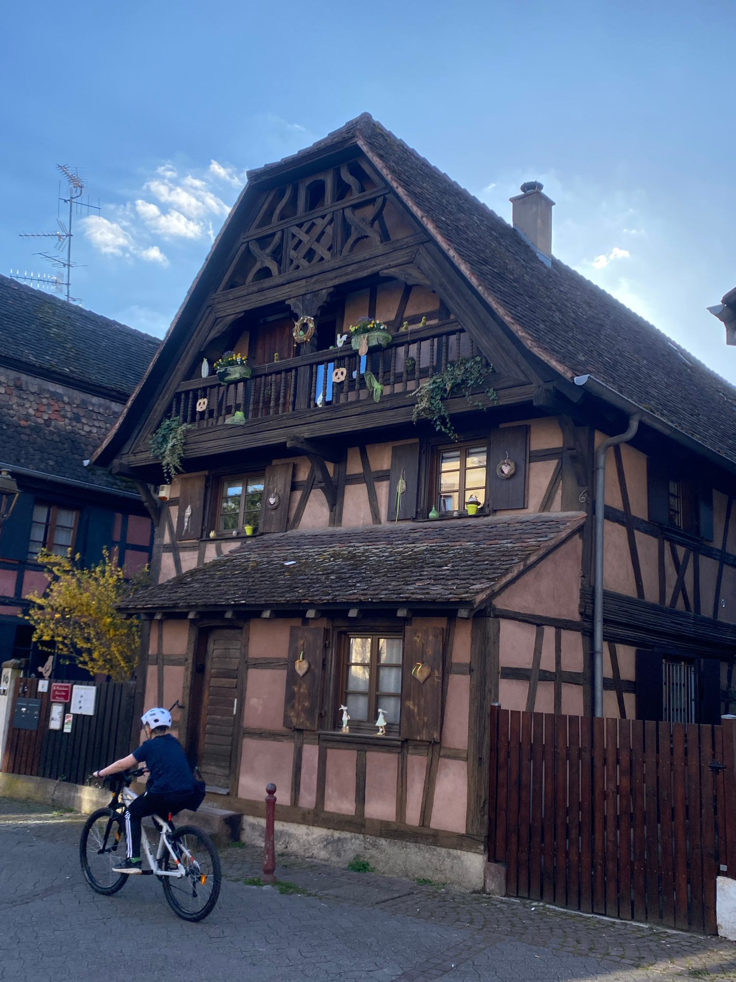 The image depicts a person riding a bicycle on a cobblestone street in front of a half-timbered house. The house has a steeply pitched roof, multiple windows with shutters, and decorative elements on…read more