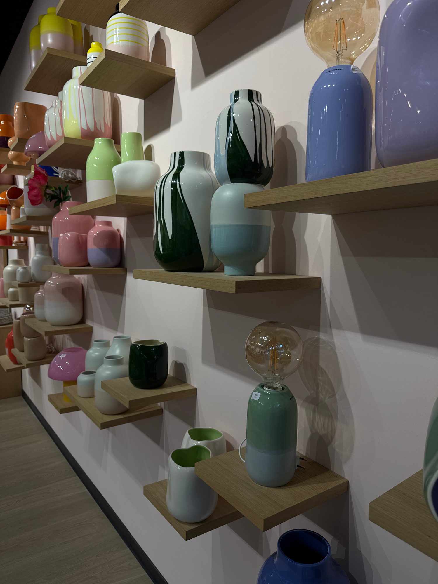 The image shows a display of colorful vases and light bulbs on wooden shelves, presumably in a retail setting. The shelves are mounted on a light-colored wall. The vases are various shapes and colors,…read more