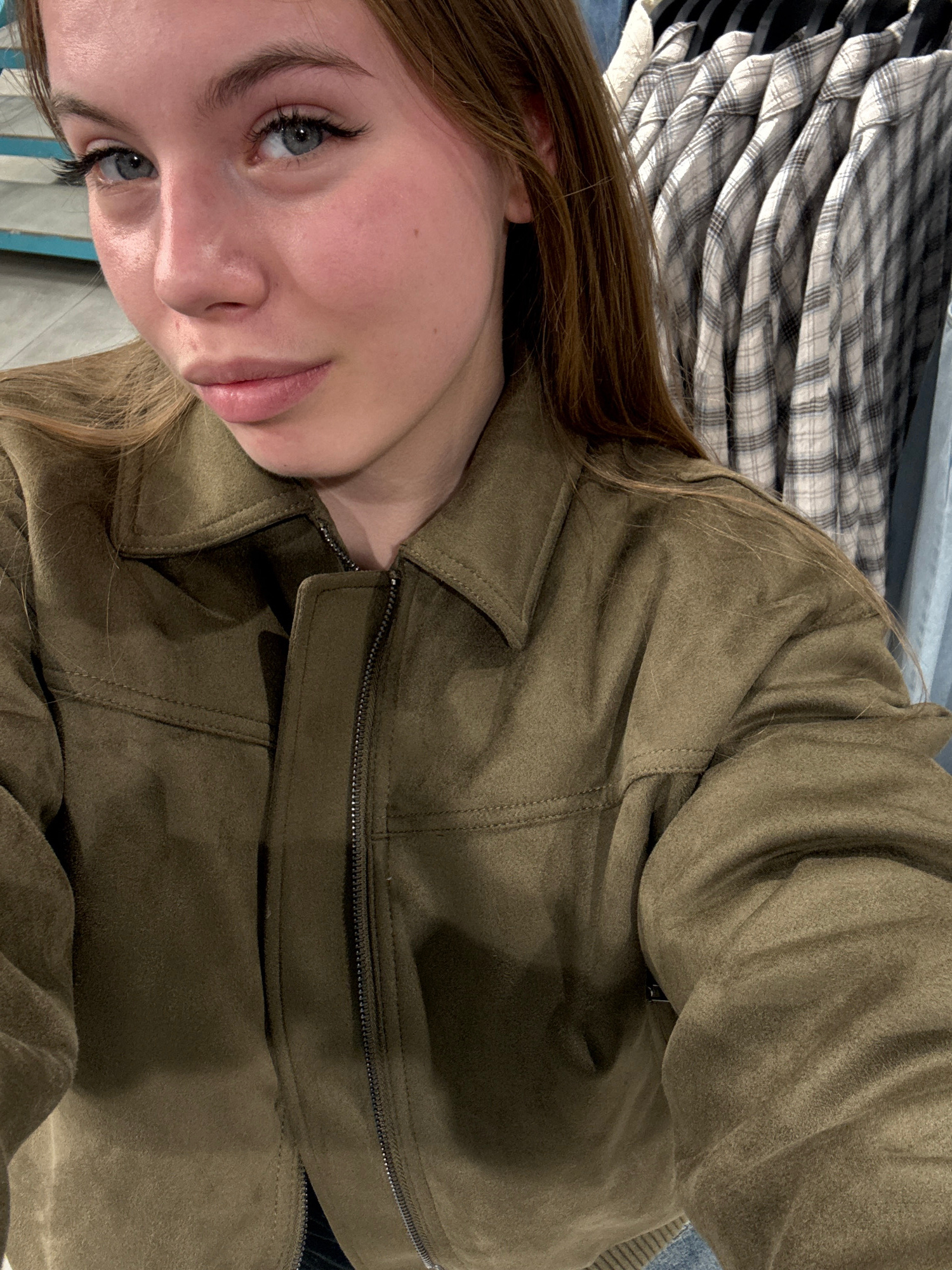This image depicts a medium close-up, vertical photograph of a young Caucasian woman, approximately late teens to early twenties, situated within a commercial retail clothing environment. The scene is…read more