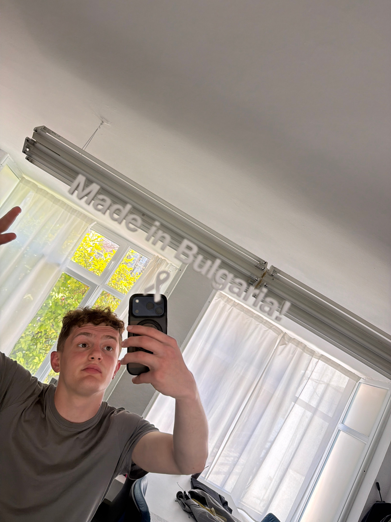 A fair-skinned young man takes a selfie in a room with a window. He holds a black smartphone in his right hand, which partially covers his face. He has brown curly hair and wears a grey t-shirt. The r…read more