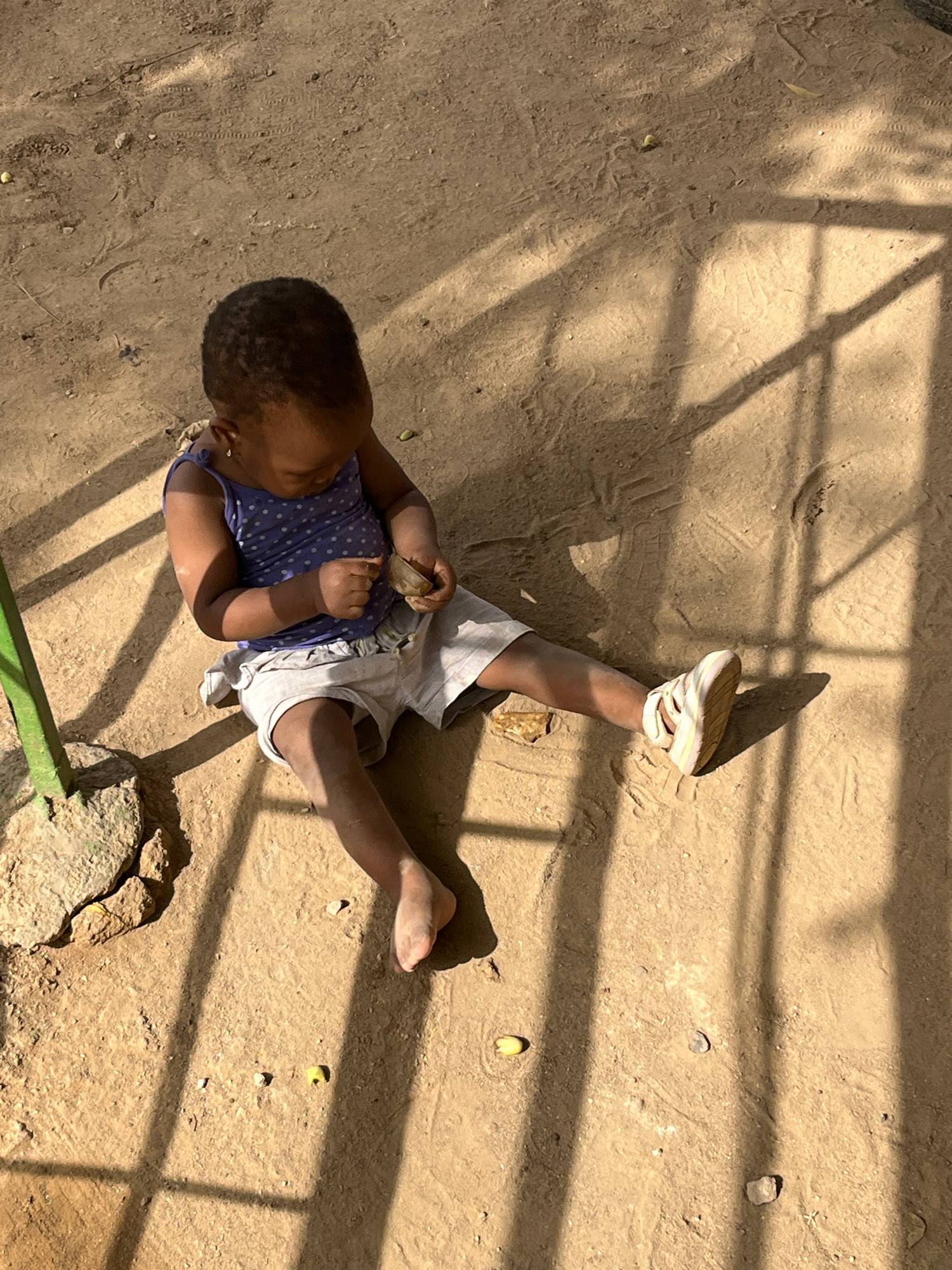 This high-angle outdoor photograph, taken in Zaria, Nigeria, shows a young child lying on a dusty, sandy ground under bright sunlight. The child, with dark skin and short, dark hair, is dressed in a b…read more