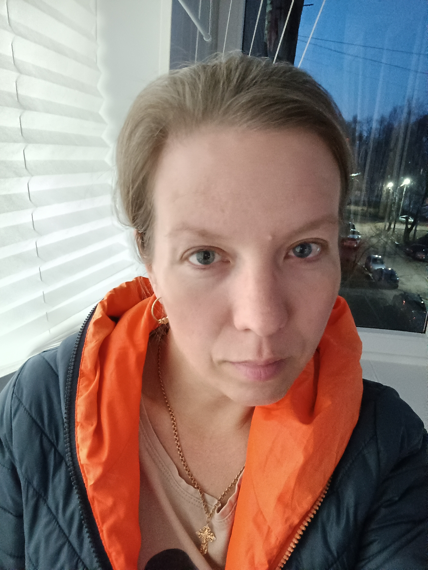 A close-up selfie captured indoors features a woman with fair skin, light blue eyes, and light brown hair pulled back from her face. She looks directly at the camera with a neutral to slightly seriousβ¦read more