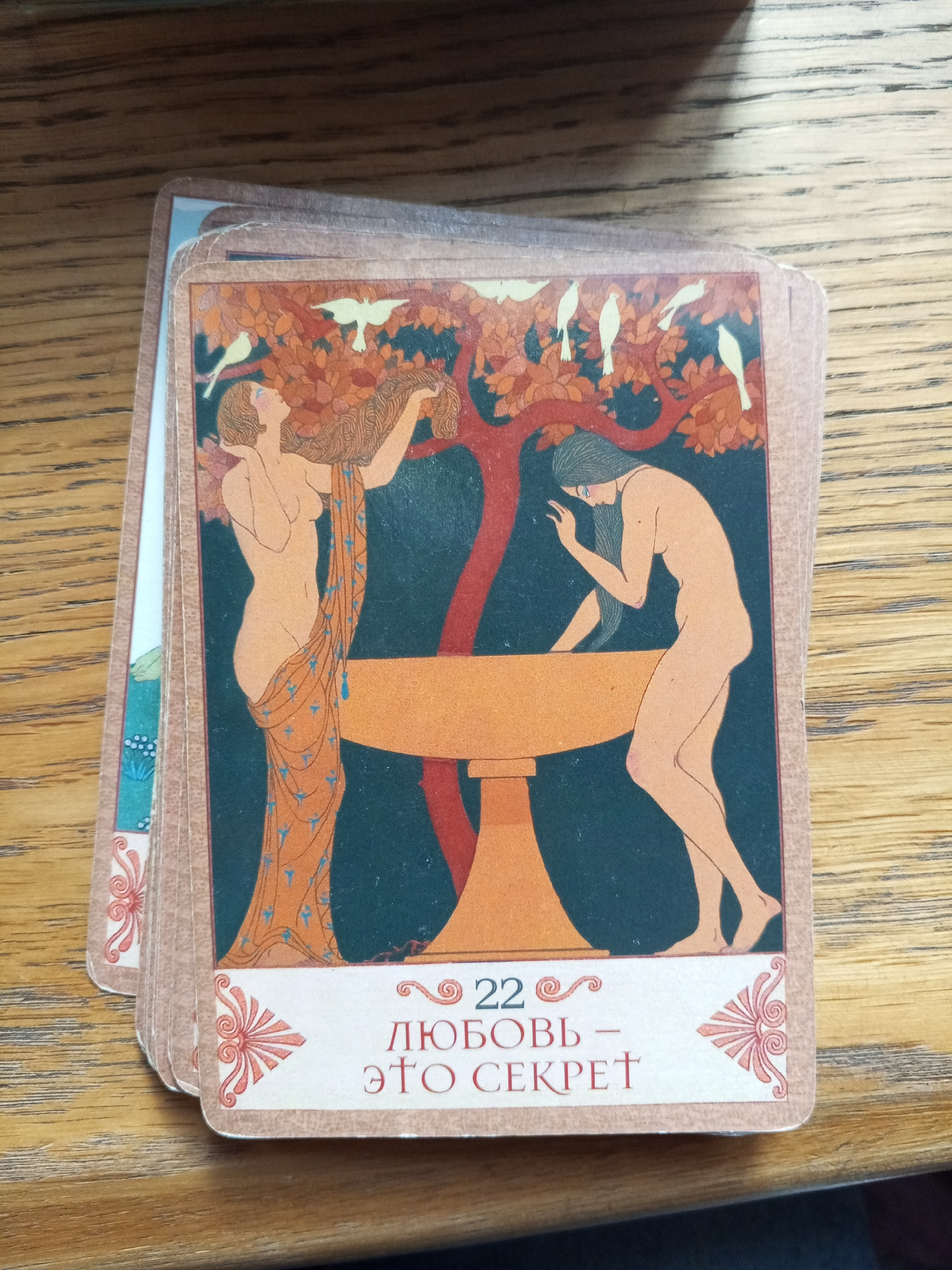 A stack of well-worn cards is centrally positioned on a wooden surface with a distinct horizontal grain. The topmost card features a stylized illustration in an Art Nouveau aesthetic, dominated by a d…read more