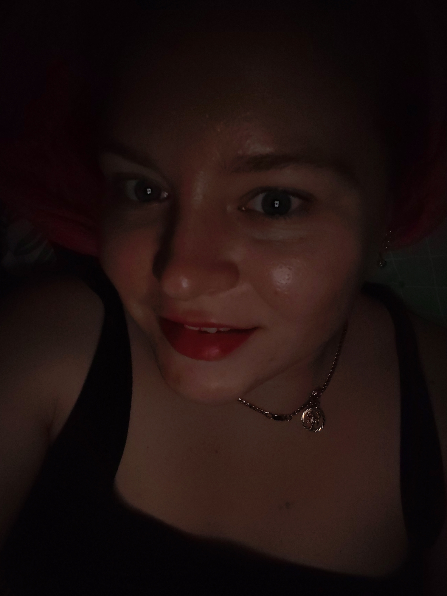 This media file captures a close-up, low-light selfie of a person, likely female, illuminated primarily from below, suggesting light from a screen. The subject has fair skin, a round face, and red hai…read more