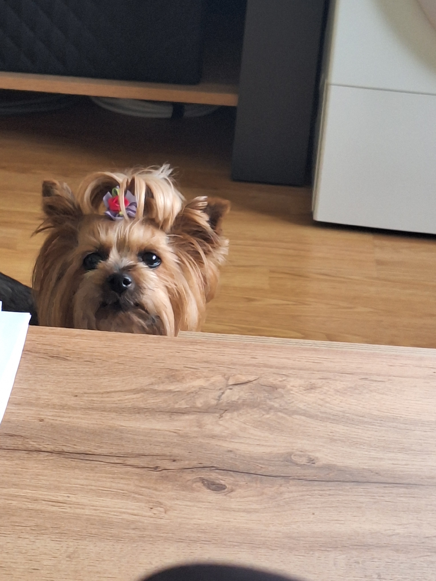 A small, light brown Yorkshire Terrier dog with a colorful hair clip on its head is looking up towards the camera from an indoor setting. The dog has shiny black eyes and nose, and its long, silky fur…read more