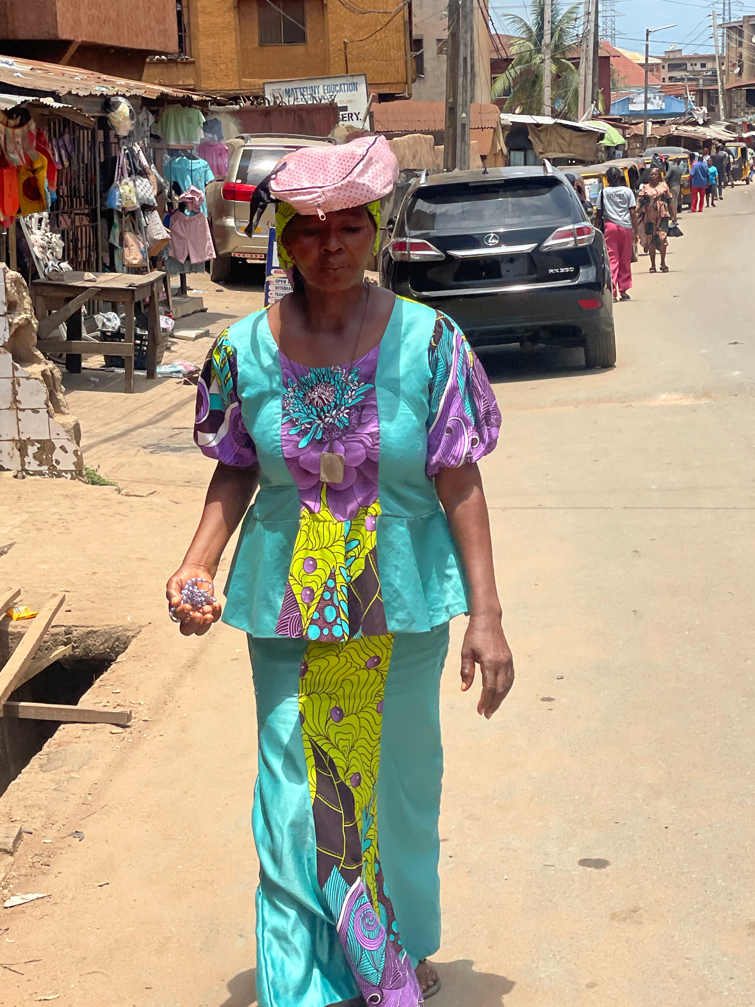 The image captures a vibrant street scene in Onitsha, Nigeria, featuring a woman in the foreground against a backdrop of a busy road and market activity under bright daylight. In the foreground, a wo…read more