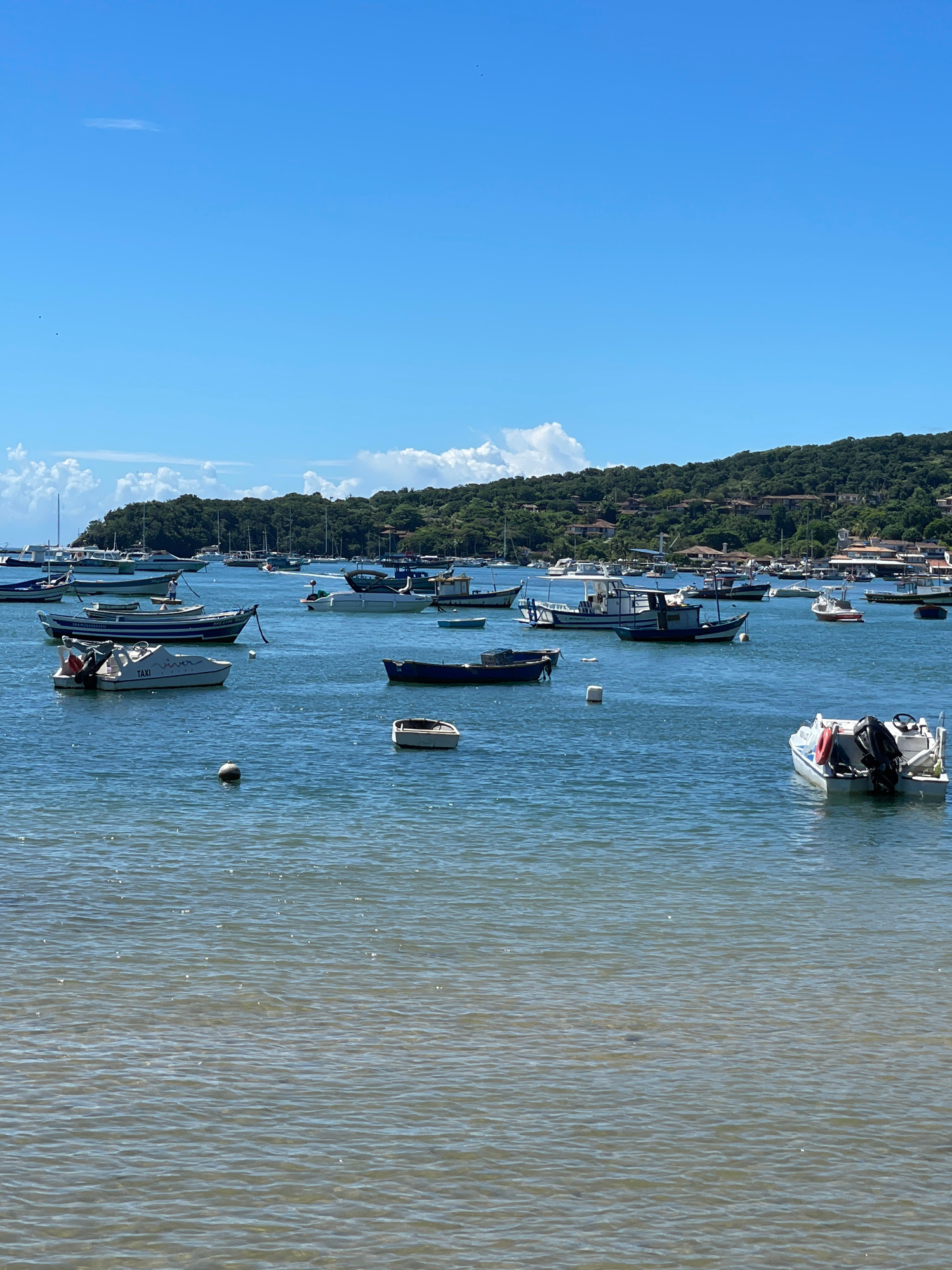 The image depicts a waterfront scene in Armação Dos Búzios, Brazil, characterized by multiple boats of various sizes anchored in a body of water. The water appears slightly choppy with evident surface…read more