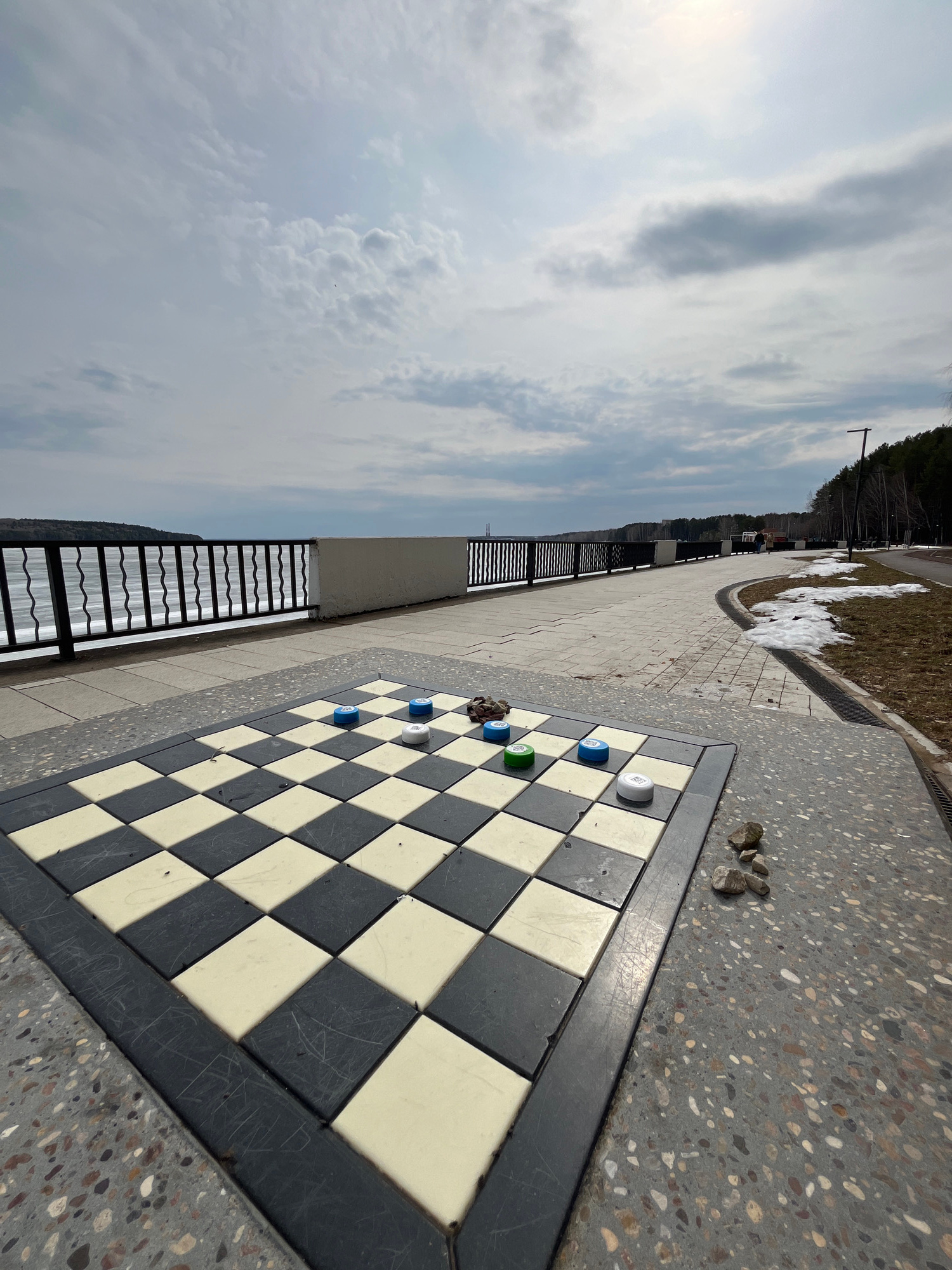 The image depicts a public space in what is likely Chaikovsky, Russia, based on visual cues such as architecture and foliage. A checkerboard is integrated into the walkway's pavement, with several che…read more