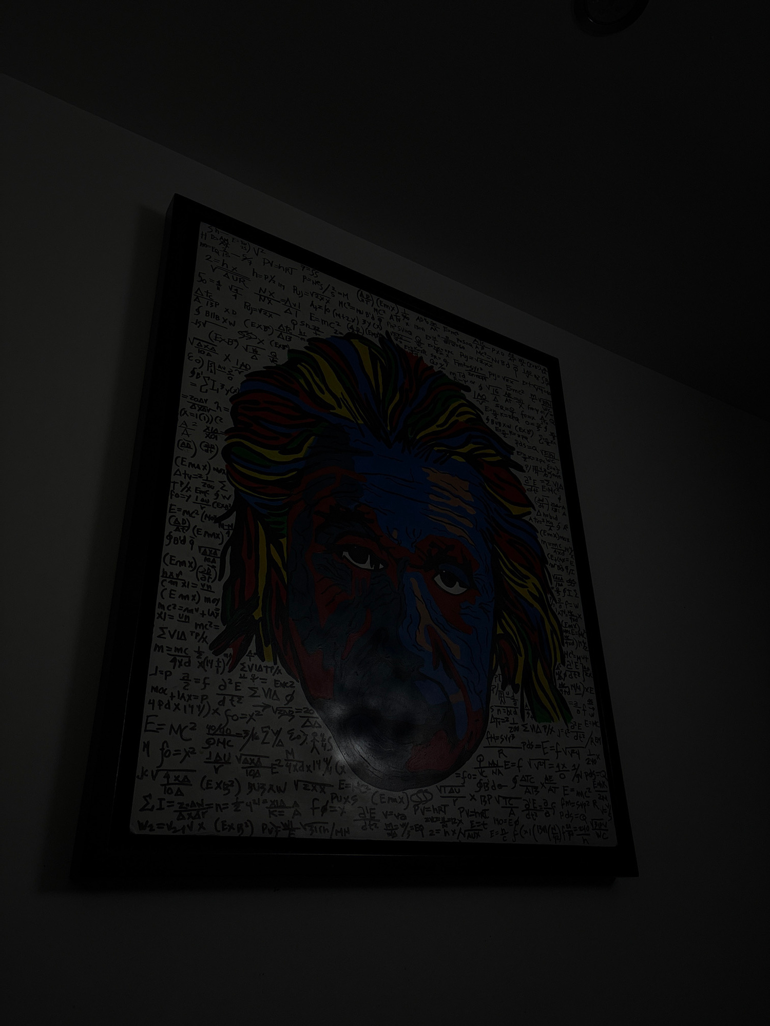 The image shows a framed painting hanging on a wall. The painting has a black frame and depicts a colorful portrait of a person surrounded by complex equations and handwritten notes. The subject of th…read more