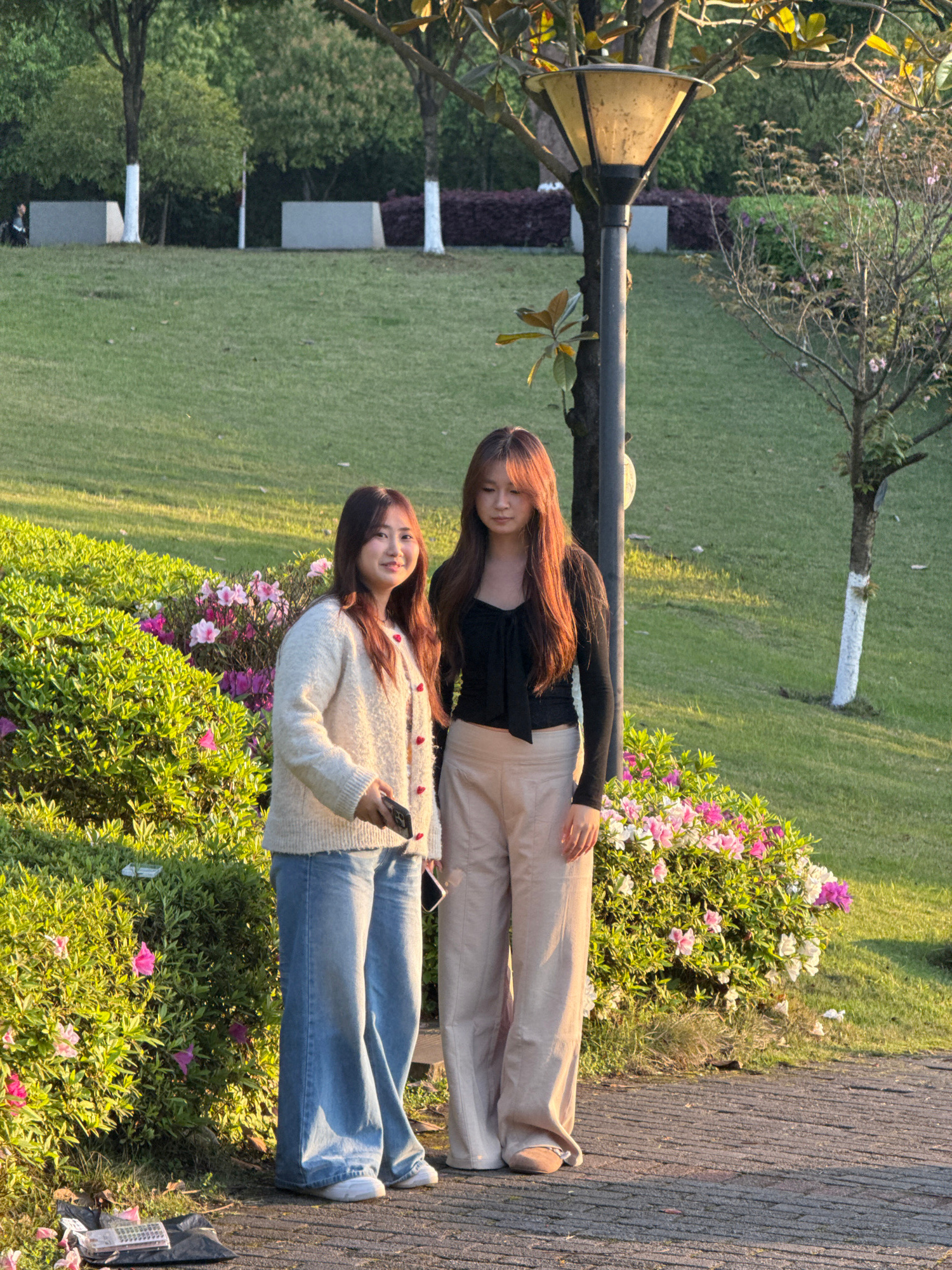 Two young women stand near a flower bed in Jiangjin, China. One woman wears a black long-sleeved shirt and beige pants. The other wears a white sweater and blue jeans. One is holding a cell phone. The…read more