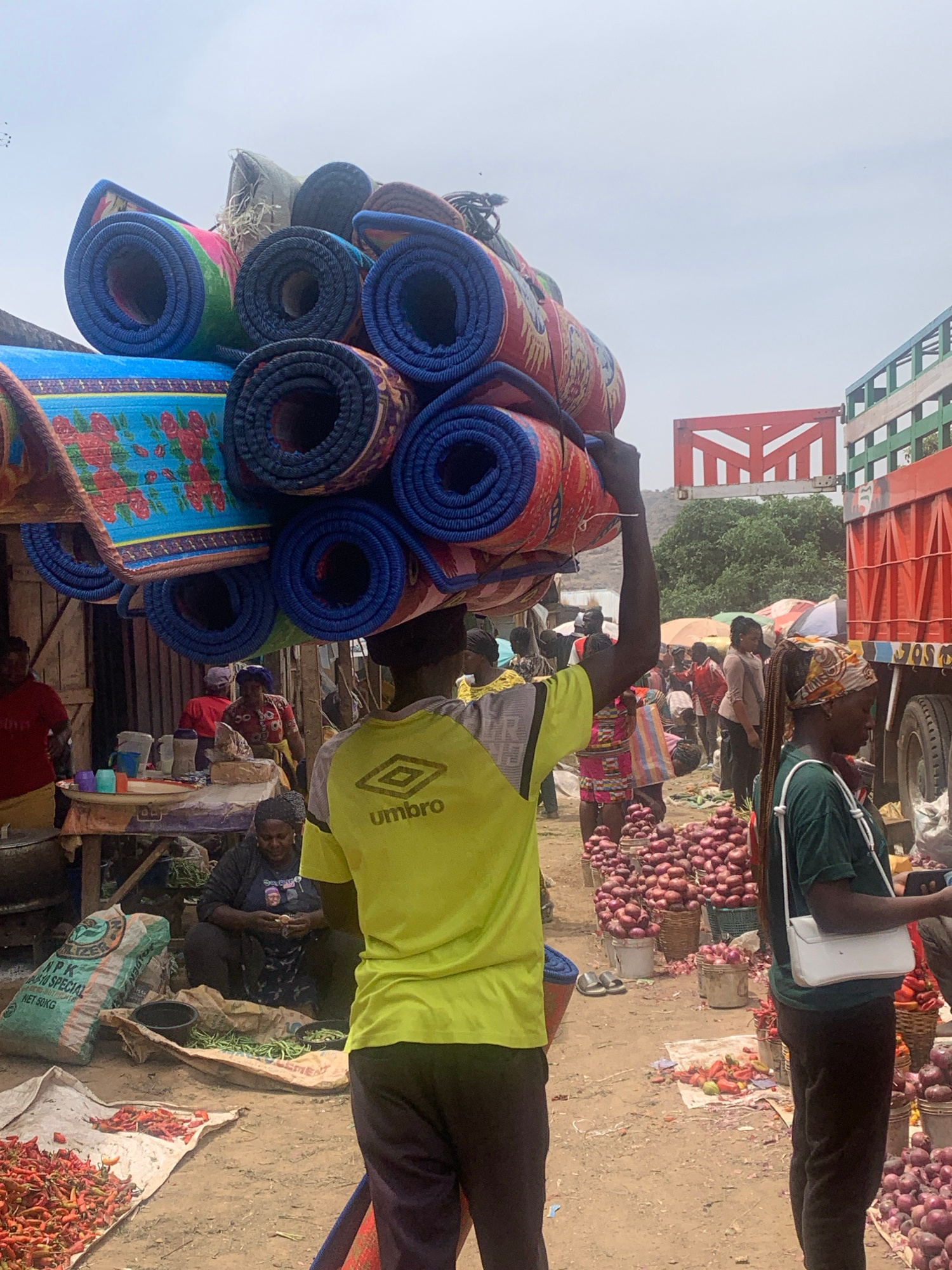 The image depicts a bustling marketplace in Jos, Nigeria. A man wearing a bright yellow Umbro t-shirt is carrying a stack of rolled-up mats. Another person, partially visible, wears a green shirt andβ¦read more