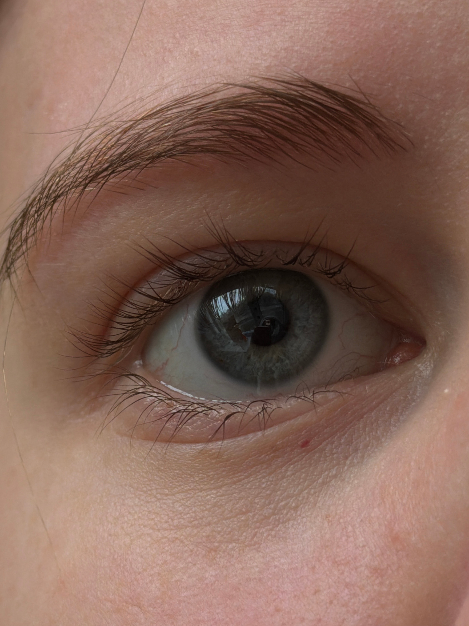 This image is an extreme close-up of a human eye, focusing on its intricate details and surrounding skin. The subject's eye features a blue-grey iris with a dark pupil that reflects indistinct shapes,…read more