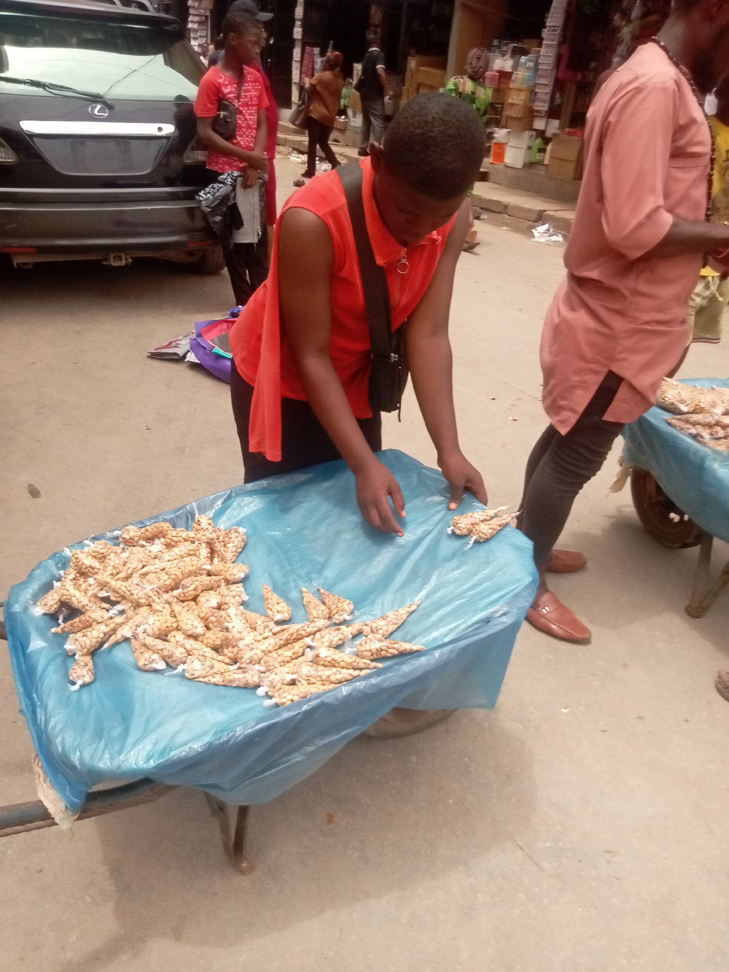 The image, taken in Fegge, Nigeria, shows a person in a red sleeveless shirt standing over a wheelbarrow filled with small, cone-shaped packages, likely food items. The wheelbarrow is lined with a blu…read more