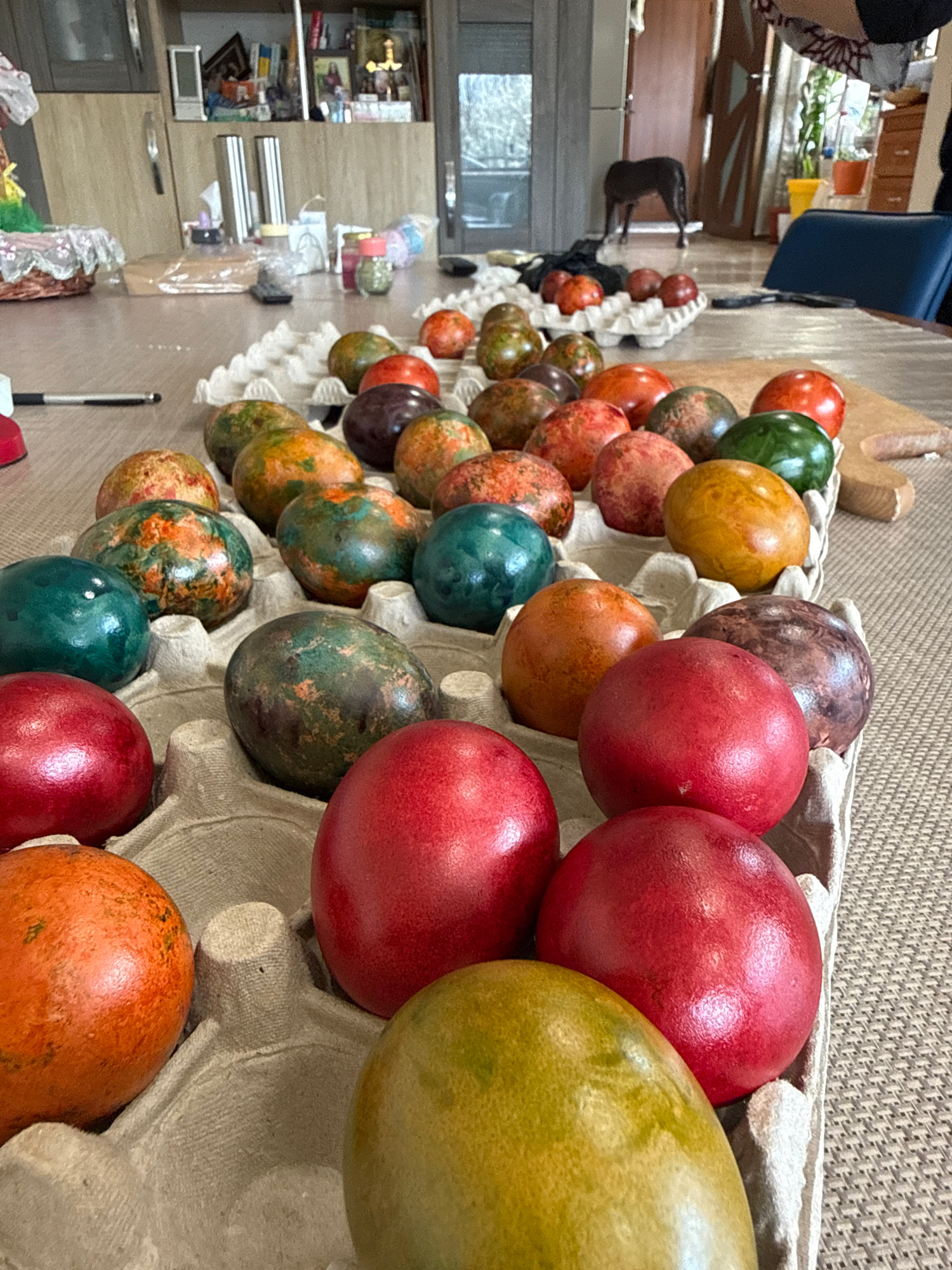 The image shows a collection of dyed Easter eggs in an egg carton. The eggs are various colors, including red, green, orange, brown, and some with marbled patterns. They are arranged in a gray cardboaβ¦read more